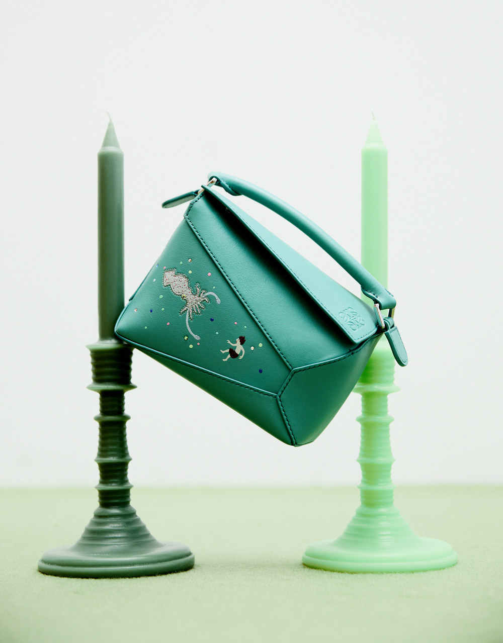 Bolso Puzzle Edge mini calamar en piel de LOEWE + candelabro de cera Incense de LOEWE Perfumes + candelabro de cera Cucumber de LOEWE Perfumes