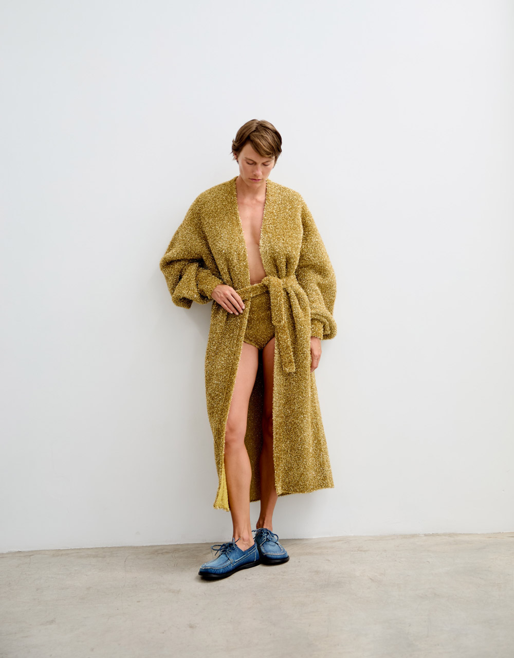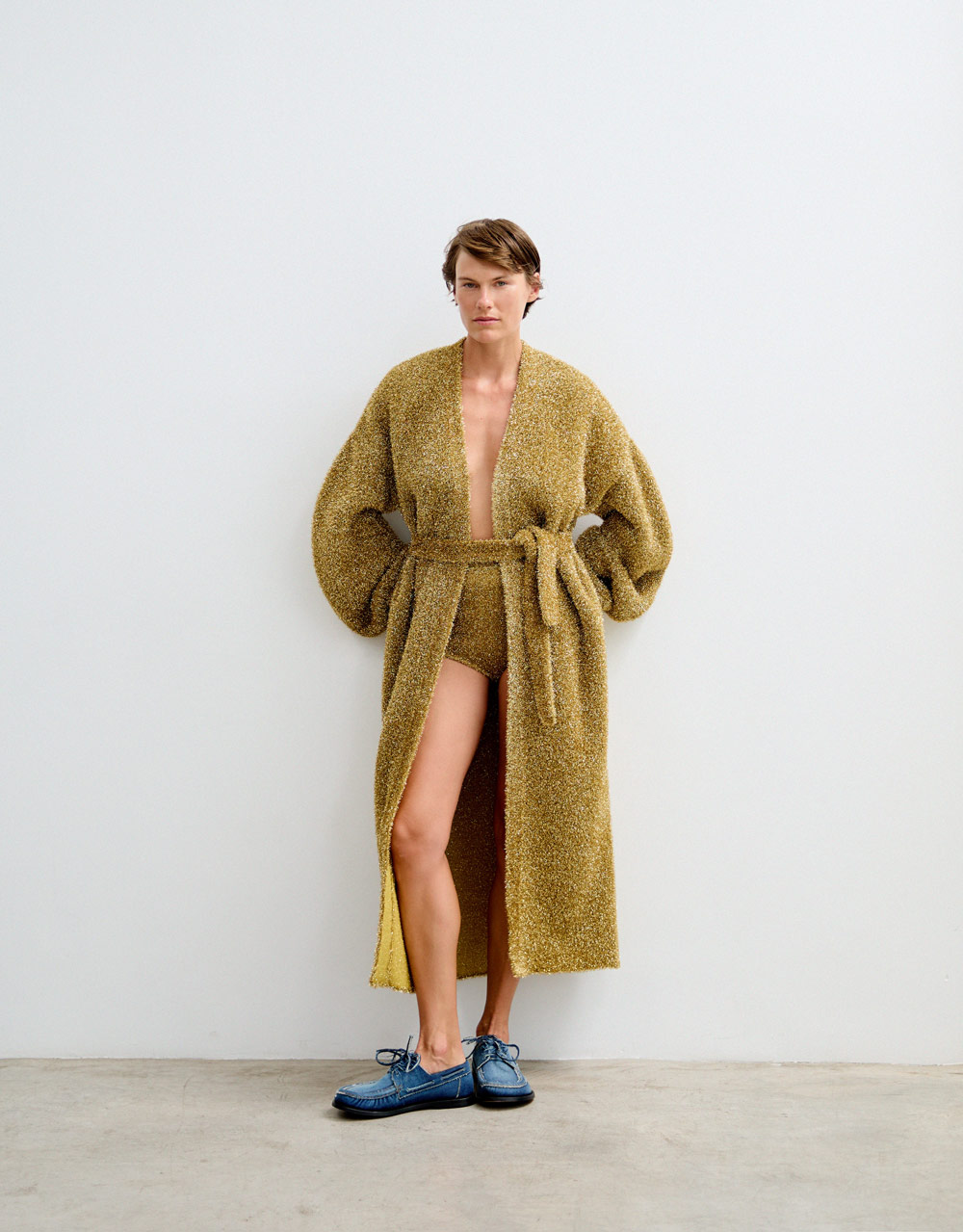 Total look LOEWE: cárdigan largo en lana y poliéster + knicker en lana y poliéster + mocasín campo denim