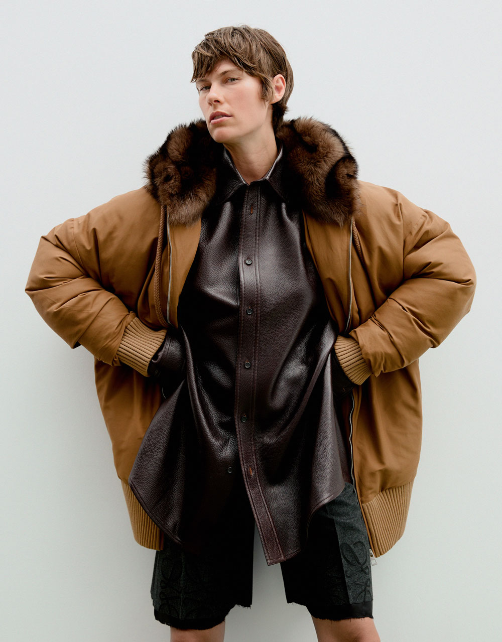 Total look LOEWE: abrigo puffer en algodón + camisa en piel + pantalón corto anagram en lana