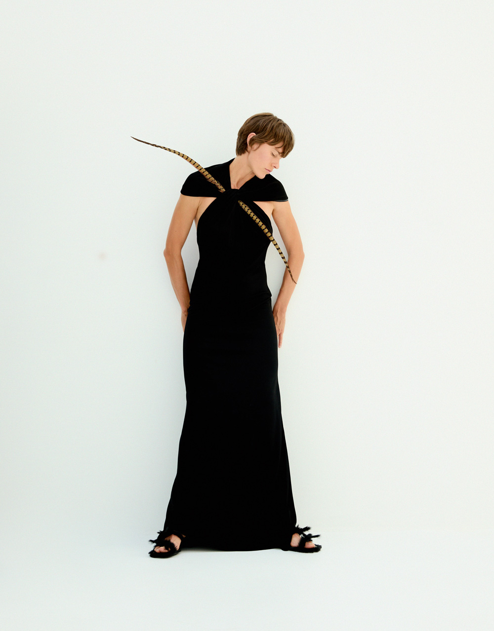 En portada, vestido en viscosa con pluma extraíble de LOEWE