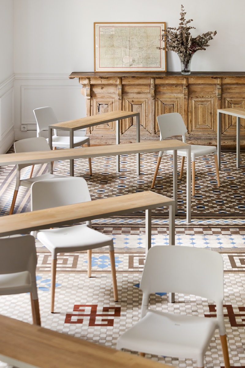 El mobiliario ha sido cuidadosamente elegido por Truyol con la idea de que se pueda adaptar fácilmente a las múltiples demandas de sus clientes. El resultado ha sido la combinación de singulares piezas antiguas, encontradas en mercados europeos, con nuevos elementos modulares, que facilitan el uso polivalente de las estancias. Muchos de los muebles están realizados a medida, como los bancos corridos y las mesas, convirtiéndose en los protagonistas de esta casa de reuniones donde reinan la versatilidad, la comodidad y la exclusividad.