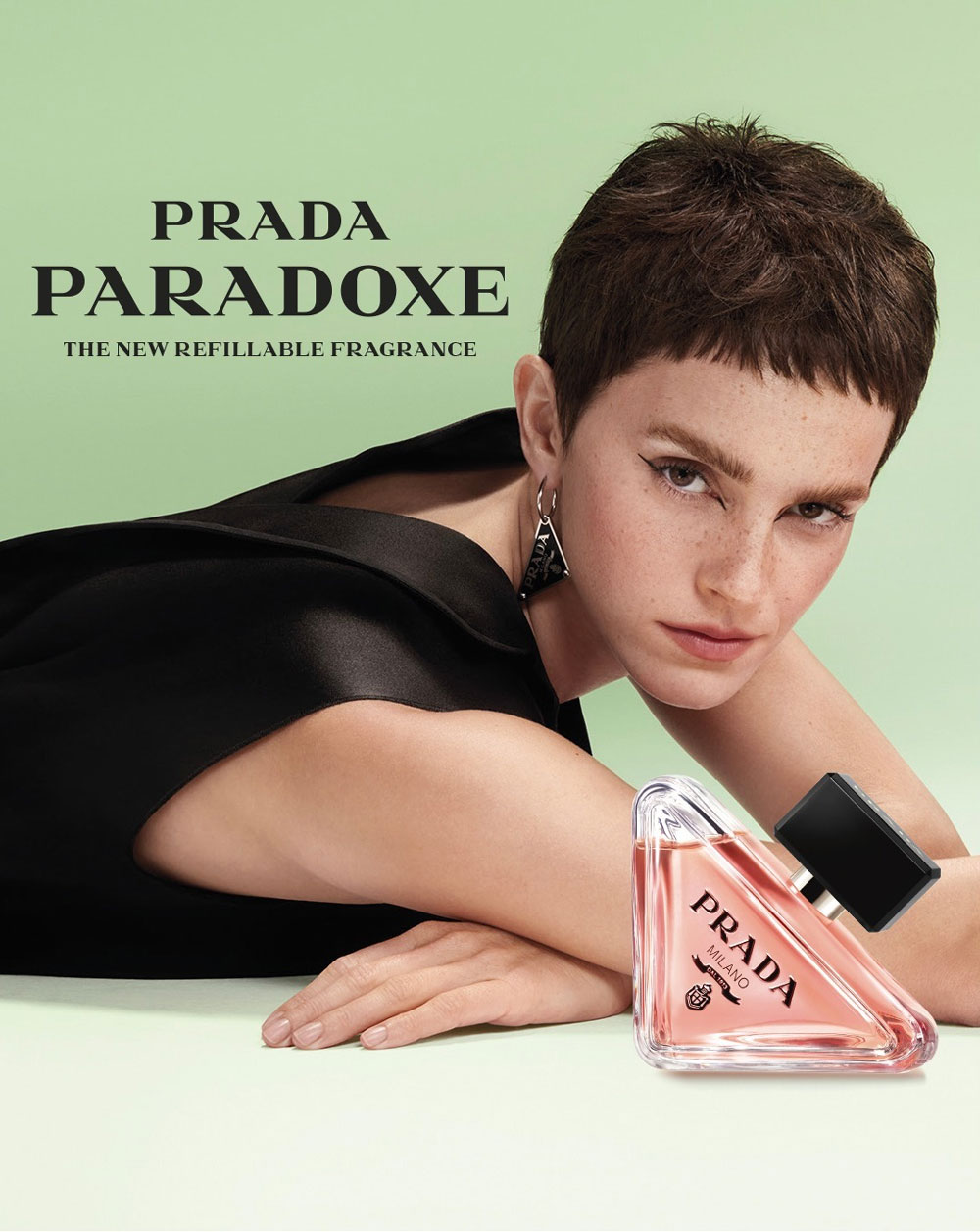 Paradoxe de Prada el nuevo perfume que rinde culto al logo triangular de la marca italiana