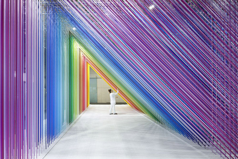 Elegí el número “100” porque es un número familiar (100%, 100 puntos…), 100 significa “mucho” pero al mismo tiempo todo el mundo puede contar fácilmente hasta el 100. Decidí condensar los 100 colores más bonitos para crear un espacio que emocionara el corazón de las personas. Quiero que la gente respire y se sumerja en esos 100 colores. Quiero que la gente sienta el color con todo su cuerpo.