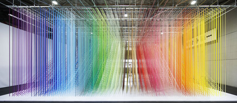 Emmanuelle Moureaux – “100 Colors” es una serie de instalaciones, iniciada en 2013, que forma el espacio utilizando 100 tonos de colores visibles en un vistazo. Coincidió con el décimo aniversario de mi estudio. En esta ocasión, decidí desvelar una instalación que expresara con fuerza y de forma sencilla mi concepto “shikiri”. Quería transmitir las emociones que sentí cuando llegué a Tokio en 1995.