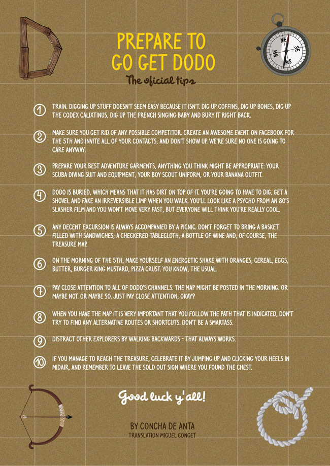 ¿Quién no ha soñado alguna vez con encontrar un tesoro escondido? Nos referimos a un tesoro de verdad, de esos que tienes que conseguir interpretando un mapa y desarrollando todo tu ingenio. Esa es la parte intelectual, porque todo buen tesoro que se precie también necesitará de un poco de fuerza física para desenterrarlo. Sí, un tesoro como dios manda tiene que estar enterrado. Para recuperar la ilusión de buscar tesoros llega ahora Dodo Magazine. Un tesoro convertido en revista impresa de la que solo hay una copia guardada en algún sitio del mundo, en un cofre enterrado. Dentro encontrarás contenidos tan interesantes como historias para leer alrededor de la hoguera, una guía para sobrevivir al ataque de un dinosaurio o una receta para un brebaje misterioso… Dodo es un proyecto hecho con mucha ilusión, sin presupuesto ni publicidad por casi 40 creadores de todo el mundo: Jean Jullien, Ricardo Cavolo, Hidrogenesse…. Para conseguir esta revista-tesoro primero tienes que hacerte con el mapa, seguir el camino y, cuando creas que has llegado al punto exacto, cavar hasta llegar al cofre. El mapa lo puedes conseguir mañana, 5 de abril, en la web de Dodo o en su facebook. Mientras tanto, os dejamos con un bonito vídeo ilustrativo y unos consejos que os serán muy útiles en vuestra búsqueda. Say Dodo… and follow the way!