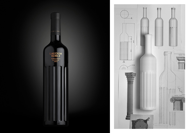 Lo curioso es que el briefing no decía nada de la botella, pero sabíamos que esta bodega produce la suficiente cantidad de vino como para amortizar los costes de una botella propia. De modo que se lo propusimos. Y nada más la vieron lo tuvieron clarísimo. ¡Esa era la botella de Laudum! Laudum es el nombre de esta familia de vinos. Es una palabra latina y pensamos basar el diseño en algo romano. Diseñamos algunas etiquetas utilizando monedas romanas o tipografías cinceladas propias de las inscripciones lapidarias o de obeliscos. De ahí surgió la idea de la columna para el diseño de la botella, que resultó ser, además, muy agradable al tacto y muy ergonómica. Los mejores proyectos son los que fluyen, en los que no hay que forzar nada para obtener el mejor resultado.