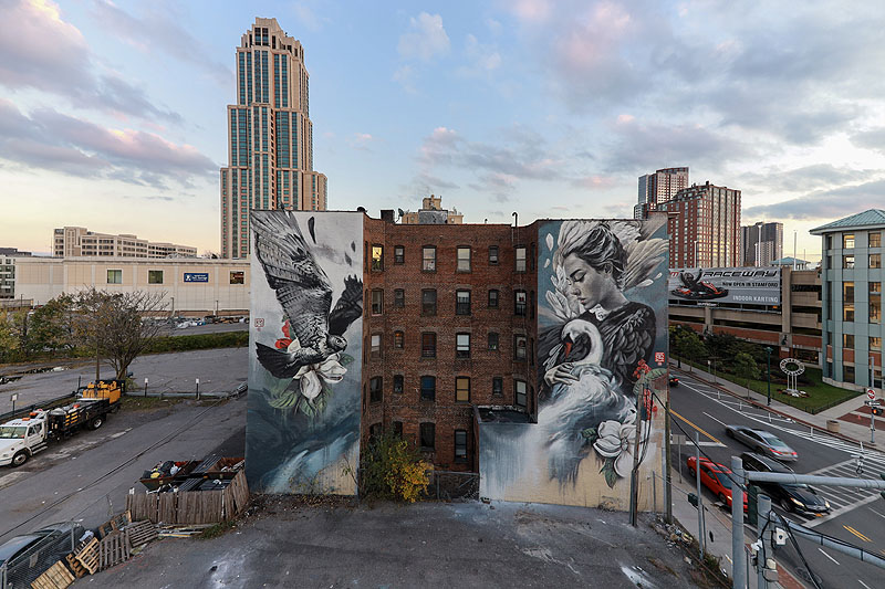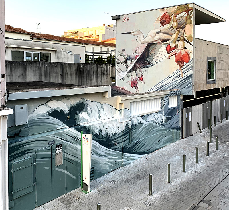 El proceso creativo parte de mi en los dos, y la manera de trabajar sobre los bocetos y cómo los creo es parecido. Los tiempos y el soporte es totalmente diferente, la función final, y el proceso también. Con el trabajo de estudio me permito más tiempo, más mimo, más detalle… También las maneras de percibirlo son diferentes, pues un cuadro lo ves a una escala humana, a una distancia cercana, mientras el trabajo en la calle está condicionado por multitud de condicionantes. La altura, la grúa, el calor, el estado de la pared, el ruido, el tráfico… El taller es mucho más controlable y más mental, mientras el trabajo en exterior es más físico, más rápido.