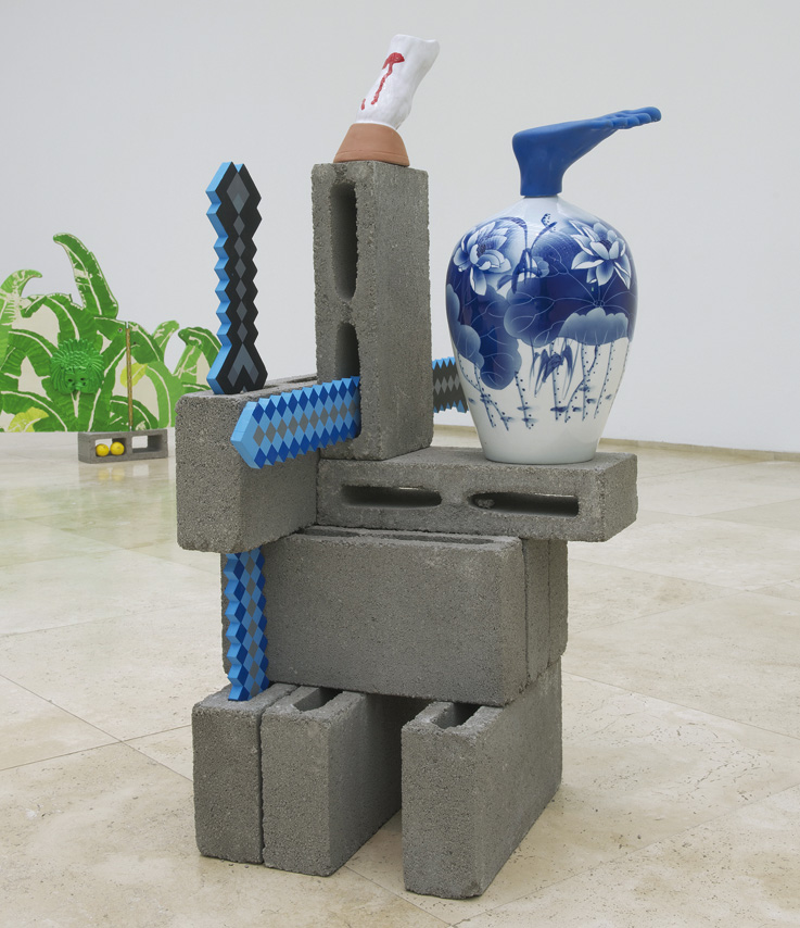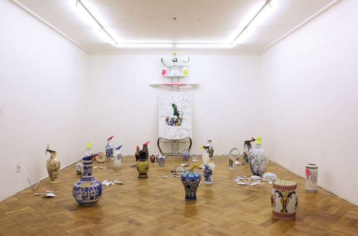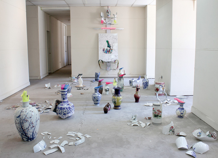¿Qué protagonismo tiene la cerámica en tu trabajo?: “Bueno, la cerámica tiene toda esa tradición precolombina en Chile pero al mismo tiempo la situación actual es que la traen los comerciantes chinos y la hacen pasar por verdadera. Siempre pienso que si un artista maya estuviera vivo ahora estaría trabajando con objetos actuales en lugar de cerámica y juntar esos dos mundos me fascina. Me gusta romperla, recombinar, repintarla con iconografía de redes sociales o fingir pedazos de interés arqueológico. En el trasfondo además hay asuntos de inmigración mas relevantes en los que puedo entrar con esa excusa”.