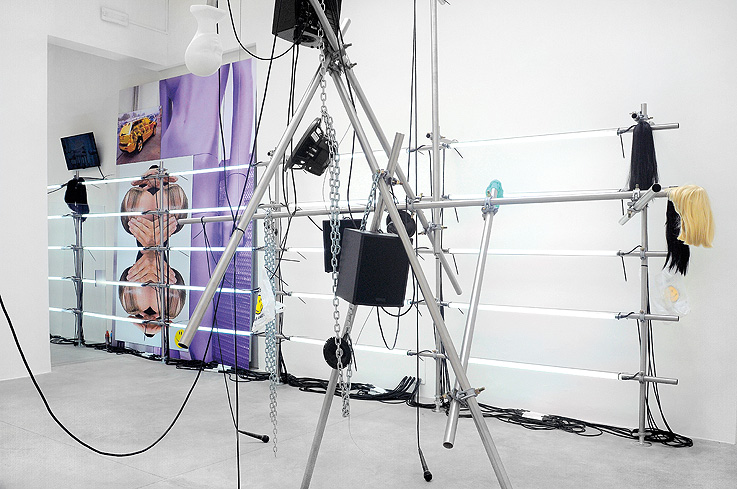 MB: Anuncios y bases electrónicas, el sonido es una parte bastante relevante en algunas de tus obras. Juega un papel protagonista porque liga el conjunto en esa melé que has planificado pero no torpedea la experiencia de la pieza siendo didáctico ni anecdótico. Utilizas además los altavoces y el cableado como parte de la instalación, todo a la vista, tripas fuera.