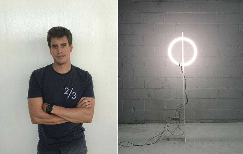 Imagen superior: Izquierda: retrato de Max Enrich. Derecha: Circle Lamp. Metacrilato y fuorescente. Diseño de Max Enrich con Guillermo Santomá y Cristian Herrera Dalmau. 2015