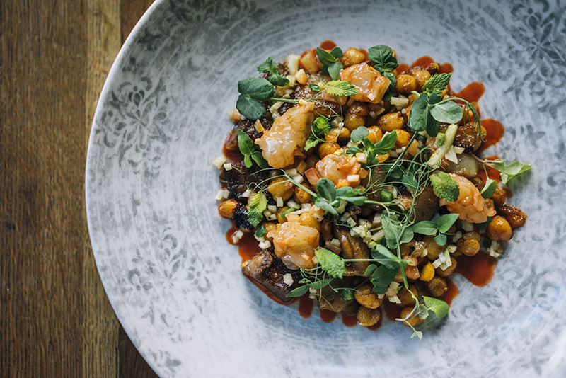 Imagen superior: Garbanzos tostados con morro y gamba roja