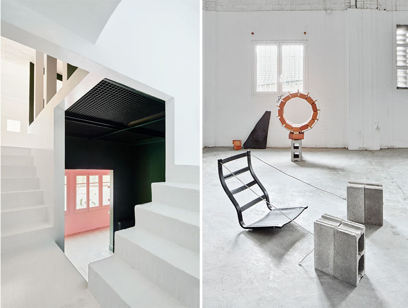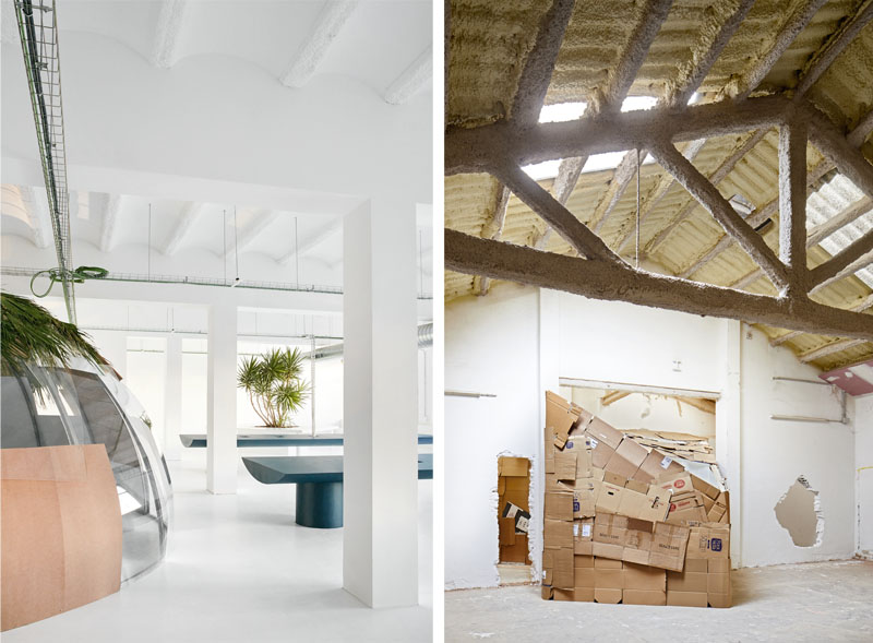 Imagen superior izquierda: Oficinas de Keenfolks. 2016. Derecha: Casa María Prats. Cartón, madera, MDF, foam y pintura blanca. 2017. Imágenes de José Hevia