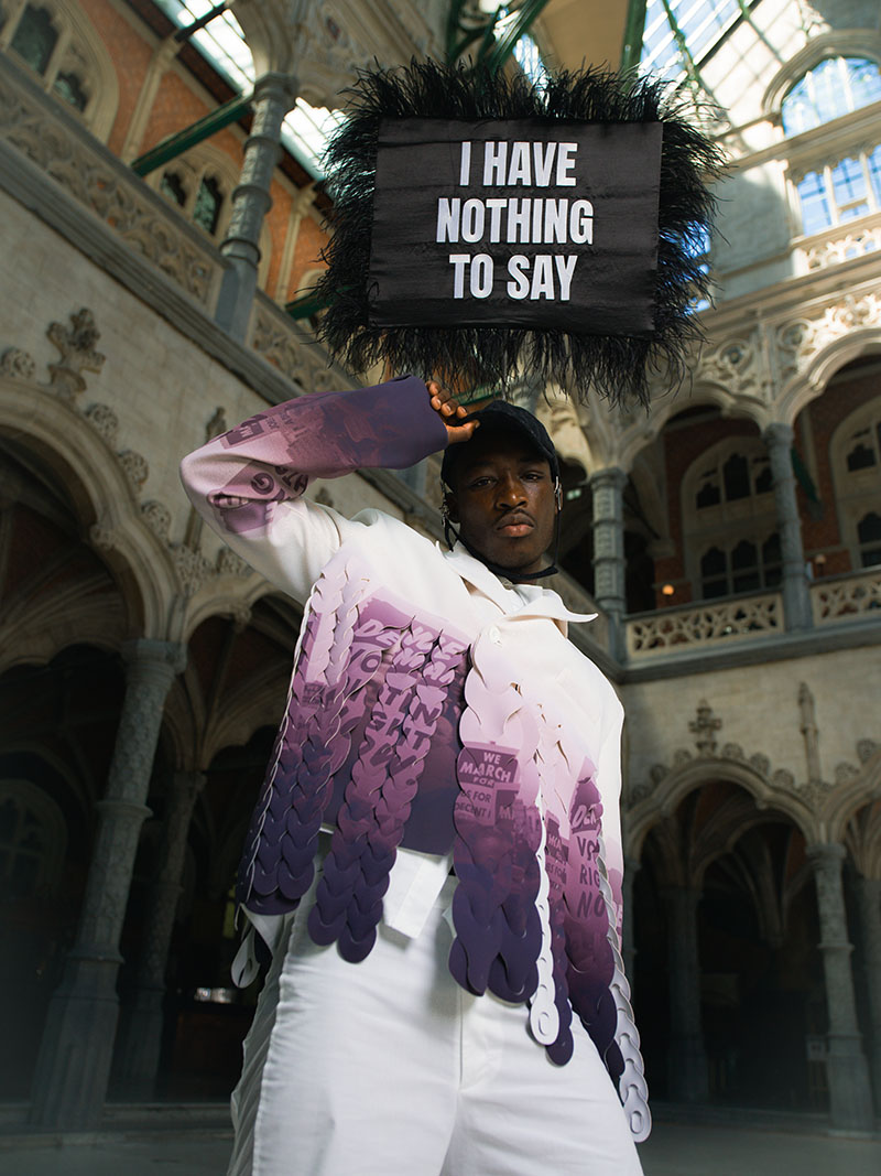 Háblame sobre el concepto de los diseños de tu colección “Duty Calls”. La colección trata sobre el poder, y más específicamente sobre el poder político. La pregunta en el origen fue: “¿Esta prenda me da poder? Y si es así, ¿cómo?”. Soy un apasionado de la política y la geopolítica, entonces para mí este tema es una forma de vincular mi interés en el mundo contemporáneo con una investigación histórica (basada en prendas de vestir) de personas en posiciones de poder a lo largo del siglo XX. El punto de partida de mi colección fue un cuestionario sobre la importancia de la familia real en Bélgica. ¿Por qué algunas personas heredan el poder sin siquiera tener que luchar por él? Personalmente, soy bastante partidario de la monarquía y, sin embargo, este sistema va en contra de los valores de igualdad que se propagan en la sociedad actual. Esta contradicción entre mis ideales y mis opiniones concretas fue la fuente de mi interés por el tema del poder.