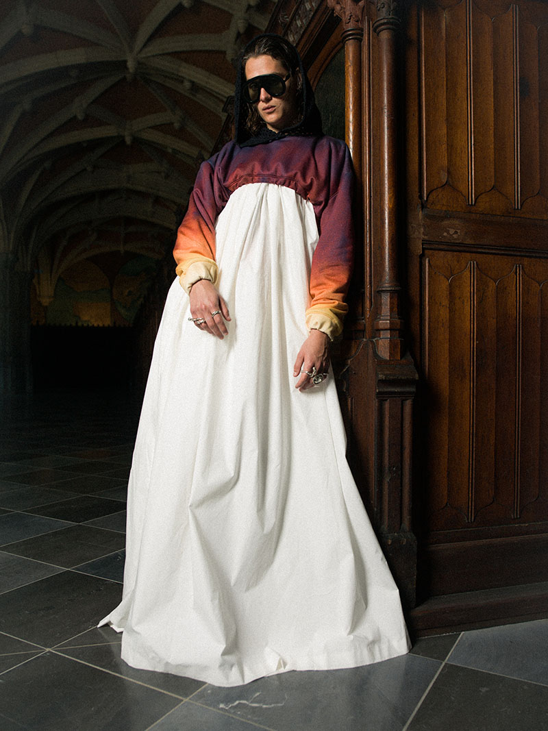 ¿Cómo está siendo tu experiencia estudiando en la prestigiosa Royal Academy of Fine Arts de Amberes? ¡Es un viaje intenso pero inspirador e instructivo! Nos empujan a experimentar mucho, a diseñar a veces cientos de looks antes de tomar la decisión final. Aprendes a empujar tus límites y los límites de la moda. No hay clases reales. Es una especie de coaching constante donde se nos enseñan a tomar decisiones, a ser críticos con el trabajo propio. Es difícil, pero este sistema de prueba y error hace que la educación en la Royal Academy of Antwerp sea única. Elegí esta escuela porque, a pesar de que en ese momento no sabía mucho sobre moda, la Academia de Amberes, especialmente gracias a sus antiguos alumnos, es un símbolo mundial para la historia de la moda. Esta escuela me hizo soñar y por eso decidí tomar parte en el examen de ingreso… Aquí estoy unos años después cursando el Máster.
