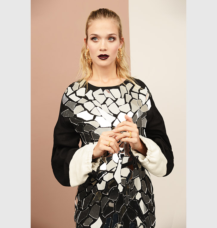 Patricia estaba un poco preocupada porque no suele maquillarse mucho. Así que nada, hemos empezado marcando un poquito el ojo con el Coffee Eye Pencil, simplemente delineando la parte interna con un tono carne para abrir la mirada. Luego, mucha máscara de pestañas Upward Lash, y en el contorno de los ojos tonos marrones con las sombras Soba Eye Shadow y Wedge Eye Shadow. Encima le puse Prima Eye Shadow, un pigmento plateado que encaja muy bien con el suéter de espejosc. A los labios les di un poquito más de fuerza con uno de los nuevos labiales Retro Matte de M·A·C, una textura fluida, como si fuera un brillo. Se extiende súper bien y luego, al cabo de unos minutos, se seca y queda totalmente mate, con acabado como aterciopelado. Se llama Retro Matte High Drama, es un tono como berenjena oscuro muy bonito. Pómulo rosadito muy suave . Como tiene la piel blanquita, la verdad es que quedaba bien un rollo dulce pero con un toque punk, un poco más duro.