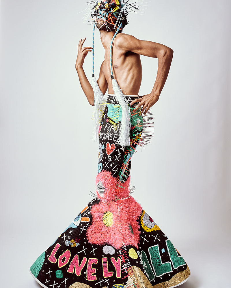 Tus diseños están en un limbo entre la moda y el arte. ¿De dónde viene esa tendencia que tienes a la hora de diseñar? ¿Cuales son tus principales fuentes de inspiración a la hora de crear? Siempre he sido malo con las etiquetas y las categorías… Creo que mi trabajo es demasiado artístico para la moda, y demasiado moda para el mundo del arte… Creo que me encanta la idea de no encajar. Eso define mucho mi propia vida. Y también me inspiro a partir de ahí. Se trata de mi propia vida, simple y sin importancia. Creo que el acto de crear es esencial para mí, al igual que comer, beber y respirar.