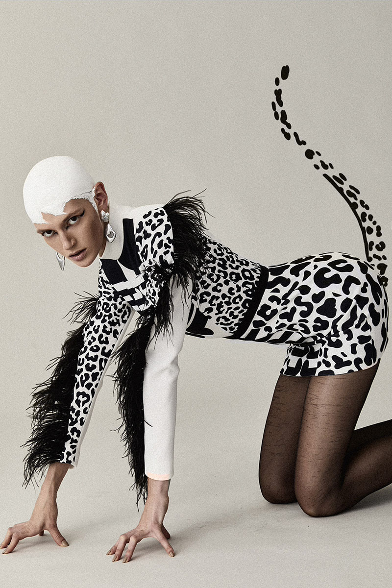 Háblanos sobre la última colección completa “Else” SS21. La colección está compuesta por 34 looks, construidos con diferentes estilos, como delicados tejidos de punto que están exquisitamente moldeados junto con looks más elegantes que incorporan estampados y estructuras más agresivas. Los grabados están inspirados en las obras abstractas de Gordon Walters, que se inspiran en formas orgánicas llamadas “Koru” que representan la evolución de una planta y cómo se ve a veces casi como código binario. Deconstruí su trabajo y los combiné con formas más orgánicas como estampados de leopardo y los imprimí en tela reciclada. Otro desarrollo textil único en esta colección es una colaboración con “Rags & Co.” que es un fabricante de alfombras de lana y seda de lujo. Juntos creamos una nueva técnica de tejido 3D que fue hecho a mano y afeitado a diferentes alturas para una apariencia especial de armadura y una sensación de profundidad.