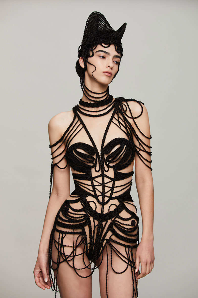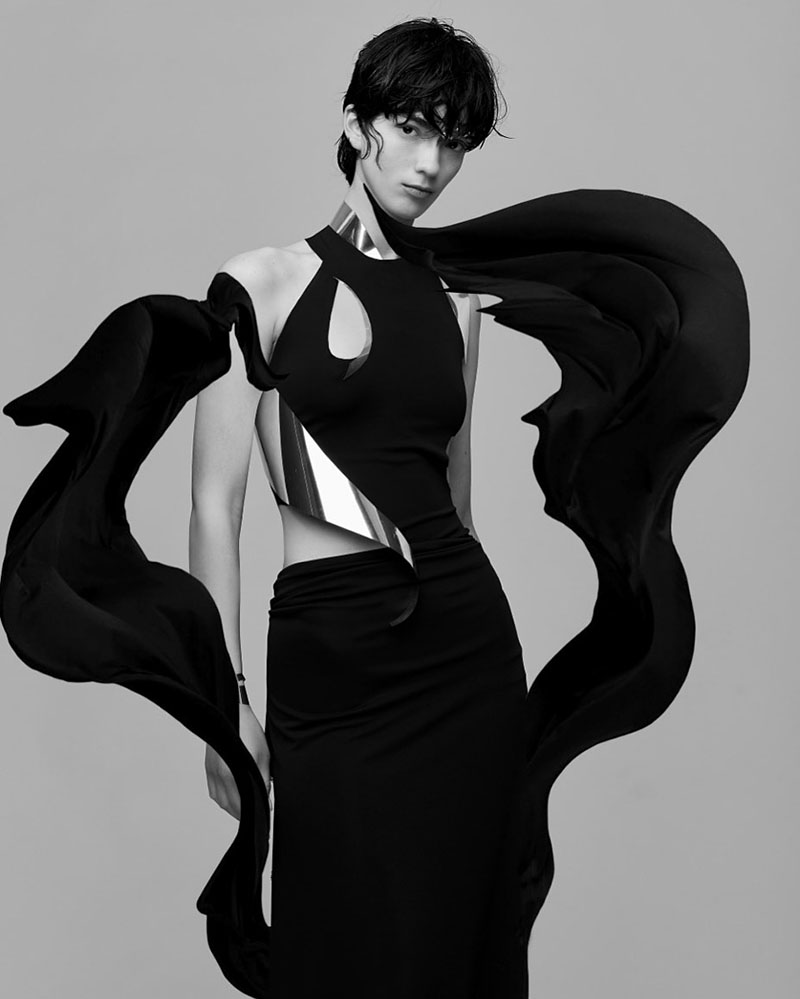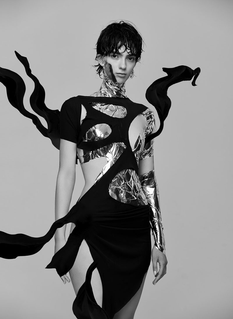 También acabas de presentar una pequeña colección cápsula llamada “Disintegration”… “Disintegration” es una pequeña colección cápsula que consta de 5 piezas que se inspira en el proceso de construcción de una prenda contra el desgarro. Es una colección de apariencia futurista que presenta estilos construidos que se rompen cuando se usan, hechos de sedas y estructuras plateadas.