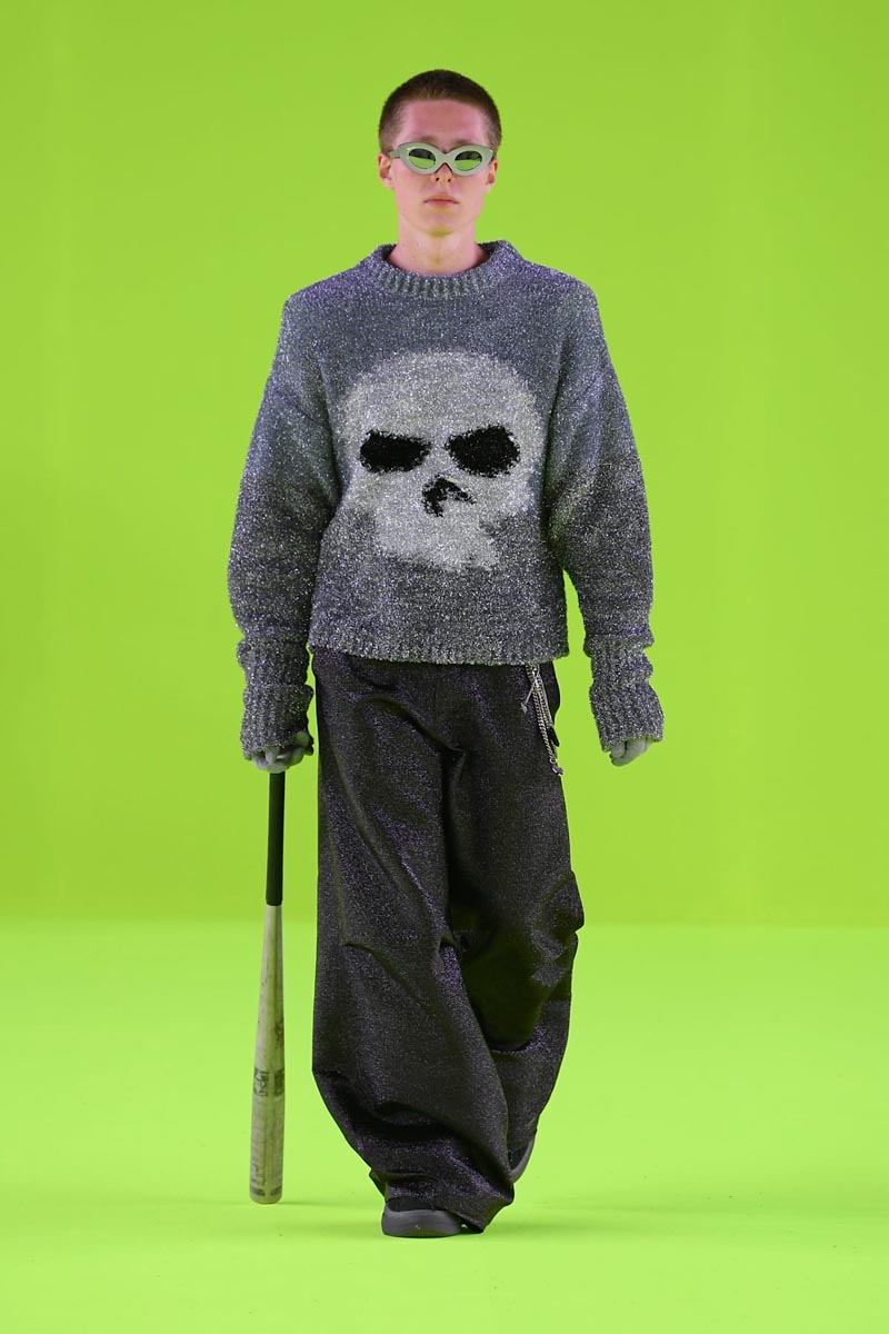 Las estrellas casuales (y más accesibles) de ERL SS24 fueron los jerséis de punto, donde tenemos que destacar el que viene decorado por skull bastante punki, y las americanas de corte relajado y sus varias reinterpretaciones deconstruidas. A estas estrellas se le suman tops ceñidos de hombros anchos en neopreno, un conjunto térmico y un look bastante referencial a porqué sabemos de ERL: una construcción arquitectónica inspirada en un abrigo puffer. Como era de esperarse, todos estos looks de high street elevado vinieron conjuntados con distintas versiones de zapatillas de inspiración skater exageradamente chunky.