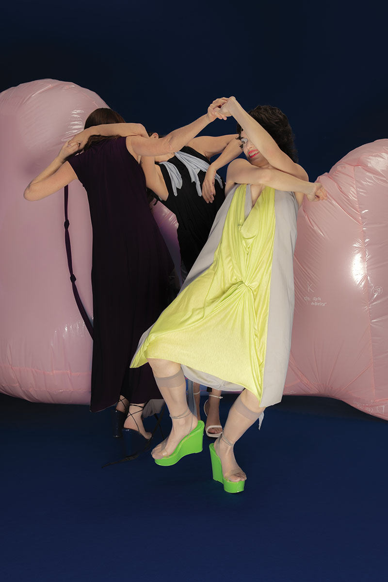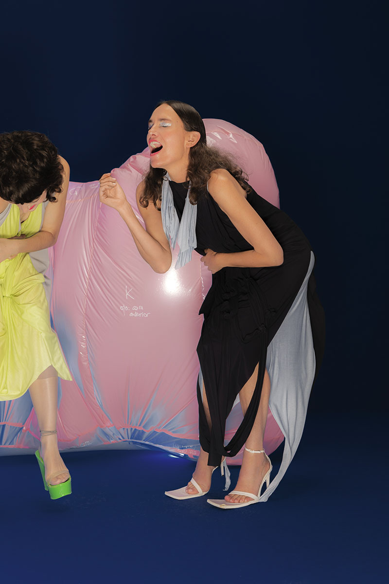 Las formas de las prendas de la nueva entrega de Ernesto Naranjo SS22 tal y como nos explica el joven creador en la entrevista que encontraréis a continuación son líquidas, y sus coloridos estampados recuerdan a las desenfrenadas noches de fiesta, llenas de momentos de locura y diversión. Toda una invitación al baño de la mismísima Peggy, como un lugar simbólico abierto a descubrir, a sentir y a divertirse conociendo arte y moda a través de formas fluidas y volúmenes sin definir.