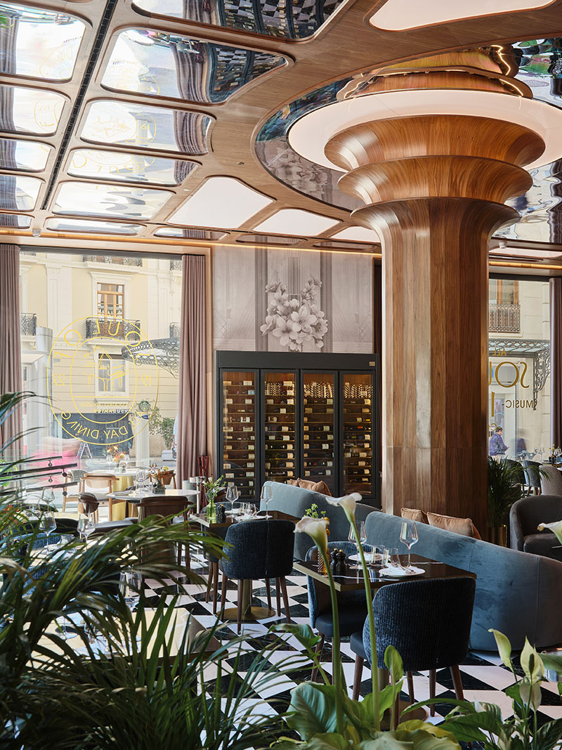 El lobby de Grand Hotel Centenari Valencia funciona como un espacio versátil que cambia de ambiente según la hora del día. Por la mañana acoge desayunos y encuentros informales; al caer la tarde, se convierte en un pequeño escenario con música en directo alrededor de un piano central. El pavimento hexagonal de piedra natural y un techo espejado refuerzan su dimensión teatral. Además, las columnas, en madera de nogal, remiten a la forma de las palmeras.