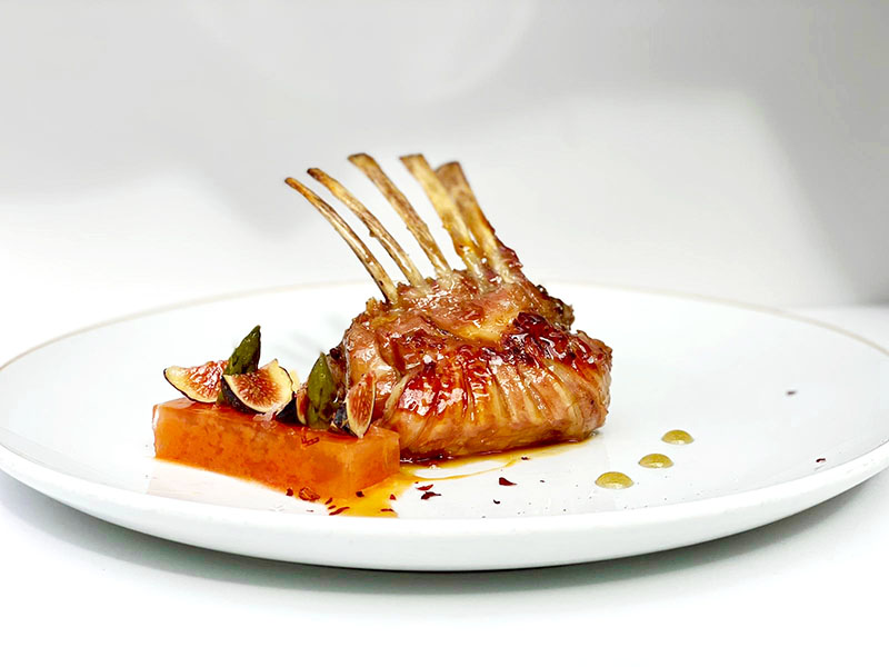 Imagen superior: Carret de Cordero IGP Corderex, lacado con mantequilla de miel dop Villuercas-Ibores y Romero. Parador de Cáceres