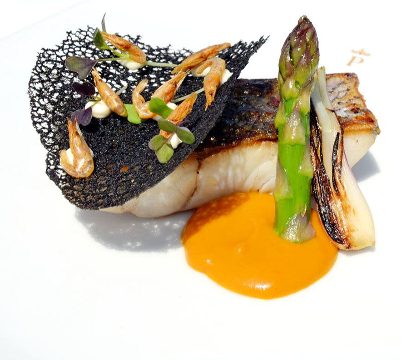 Lomo de Corvina a la parrilla con salsa de erizo y camarones, especialidad del Parador de Cádiz
