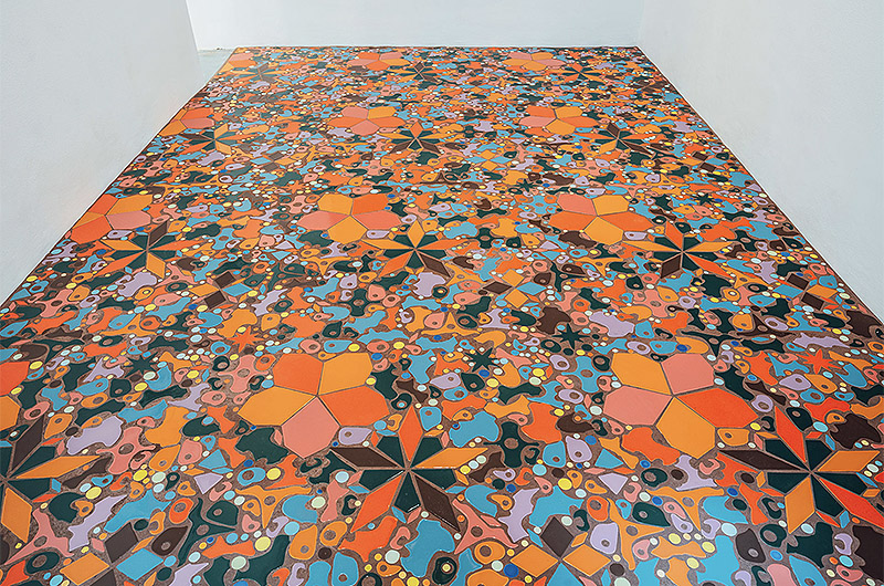 Una de las características distintivas de Pardo es el uso del color y formas orgánicas. En Elba Benítez, la exposición comienza con un suelo cubierto de piezas de cerámica dispuestas a modo de mosaico multicolor. Estos azulejos cerámicos, cargados colores, emoción y formas, parecen crear una secuencia de ritmos sin que haya movimiento alguno: a veces la quietud también puede ser un acto de dinamismo.