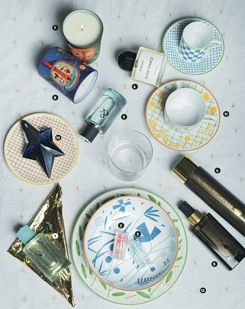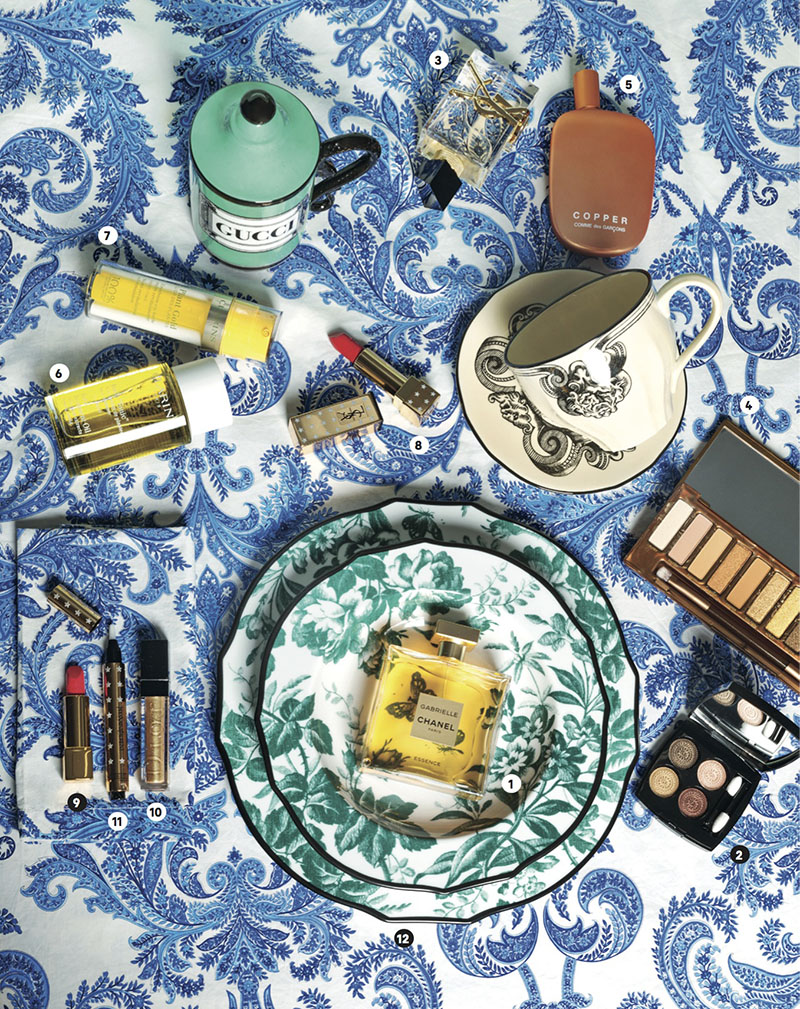 Bodegón arriba especial cosmética Navidad: (1) Perfume ‘Gabrielle’ de Chanel. (2) Paleta de sombras ‘Les 4 hombres’ de Chanel. (3) Eau de Parfum ‘Libre’ de Yves Saint Laurent. (4) Paleta de sombras ‘Naked Honey’ de Urban Decay. (5) Fragancia agender ‘Copper’ de Comme des Garçons. (6) Aceite reafirmante corporal Huile ‘Tonic’ de Clarins. (7) Emulsión en aceite nutritiva de origen natural ‘Plant Gold’ de Clarins. (8) ‘Le Rouge’ No1 de Yves Saint Laurent edición especial ‘High on Stars’. (9) Labial ‘Rouge Allure’ de Chanel de edición limitada Rouge Splendide. (10) Sombra de ojos + eye-liner ‘Diorshow Liquid Mono’ tono Gold Twinkle. (11) Lápiz iluminador ‘Touche Éclat’ de Yves Saint Laurent edición especial ‘High on Stars’ . (12) Vajilla de Gucci.