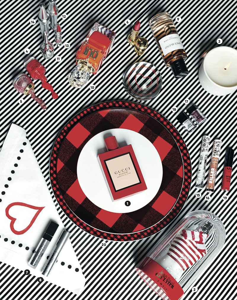 Bodegón arriba especial cosmética Navidad: (1) Perfume ‘Ambrosia di Fiori’ de Gucci Bloom. (2) Versión ‘Christmas Collector’ del clásico Eau de Toilette ‘Le Male’ de Jean Paul Gaultier. (3) Vela Aromática ‘Île Blanche’ de Louis Vuitton. (4) Esmalte de uñas ‘Scandalous’ de Morgan Taylor Professional Nail Lacquer. (5) Top Coat de purpurina edición especial ‘Happy 2020’ Diorific Vernis de Dior. (6) Labial Rouge ‘Diorific’ tono Passion. (7) Sombra de ojos + eye-liner ‘Diorshow Liquid Mono’ tono Silver Flakes. (8) Mascara de pestañas ‘Kush High Volume Mascara’ de Milk Makeup. (9) Perfume ‘Spice Blend’ de Christian Dior. (10) El fresco y atrevido perfume ‘Oui’ de Juicy Couture. (11) Gel-crema todo en uno con pincel ‘Ka-Brow!’ de Benefit. (12) Gel Invisible ’24-Hour Brow Setter Gel’ de Benefit. (13) Gel voluminizador para cejas ‘Gimme Brow’ resistente al agua de Benefit. (14) Gel con reflejos para cejas ‘3D Browtones’ de Benefit. (15) Labial Voluminizador ‘Filler Instinct’ Let’s Glaze de NYX. (16) Labial Voluminizador ‘Filler Instinct’ Brunch Drunk de NYX. (17) Purpurina Metallic Glitter ‘Beauty Beam’ de NYX Professional Makeup. (18) Metallic Glitter ‘Lumi Lite’ de NYX Professional Makeup. (19) Intense Butter Gloss de NYX Professional Makeup. (20) Servilleta, vajilla y pisapapeles de Dior Maison.