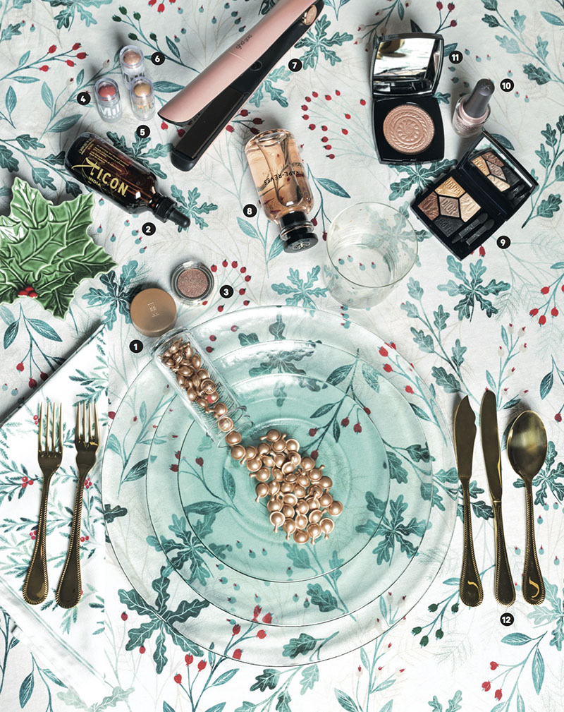 Bodegón arriba especial cosmética Navidad: (1) Cápsulas de Vitamina C ‘Radiance Renewal Serum’ de Ellisabeth Arden. (2) Aceite para el cabello ‘India Oil’ de I.C.O.N. (3) Sombra de ojos ‘Mono Glitter Ombre Sparkle’ de Clarins, tono 102. (4) Stick de labios dos en uno con color de Milk Makeup. (5) Highlighter holográfico ‘Mars’ prismatic en stick de Milk Makeup. (6) Mini ‘Stick Matte Bronzer’ para contour de Milk Makeup. (7) Planchas de pelo ‘Platinum + Royal Dynasty’ de GHD (8) Perfume ‘Atrape-Rêves’ de Louis Vuitton. (9) Paleta de sobras de ojos edición especial ‘Happy 2020’ de Dior. (10) Esmalte de uñas ‘Luxe Be a Lady’ de Morgan Taylor Professional Nail Lacquer. (11) Polvo iluminador ‘Éclat Magnétique’ de Chanel tono Metal Peach. (12) Servilleta, vajilla, vaso y cubertería de Zara Home.