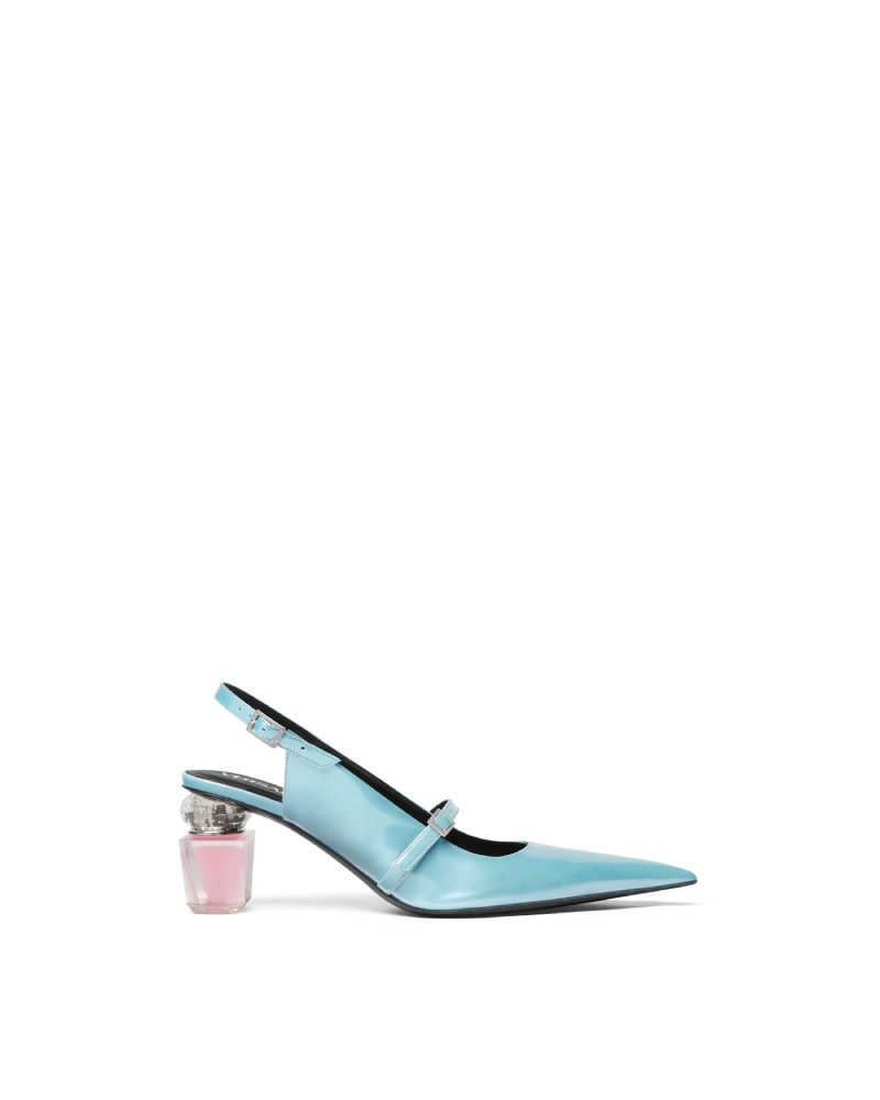 Las tendencias de accesorios 2025 están apuntando a una vuelta a los estilos más clásicos y formales; especialmente en el terreno del calzado. Los zapatos slingback están haciendo un comeback muy fuerte como silueta estrella, pero los de Versace tienen un componente más extra. Los de su nueva colección apuestan por exagerar la silueta con un tacón joya en forma de botella de cristal y con empeines decorados con brillantes. Y si eso no es suficiente, se ofrecen en colores de acabado metálico ideales para la temporada.