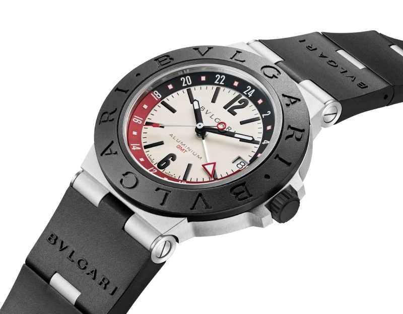 Abriendo este nuevo capítulo para el mítico Bvlgari Aluminium tenemos la versión más clásica del nuevo modelo. Ahora, el icónico reloj de aluminio (con caja de 40mm) presenta una complicación GMT para los trotamundos más modernos. El look se mantiene fiel al original, con su mezcla de aluminio plateado, caucho negro y esfera blanca (envejecida en este caso). Los detalles de esta función se resaltan en rojo, para una mejor legibilidad y contraste. Pero, fuera de este nuevo plus, todo se mantiene og.