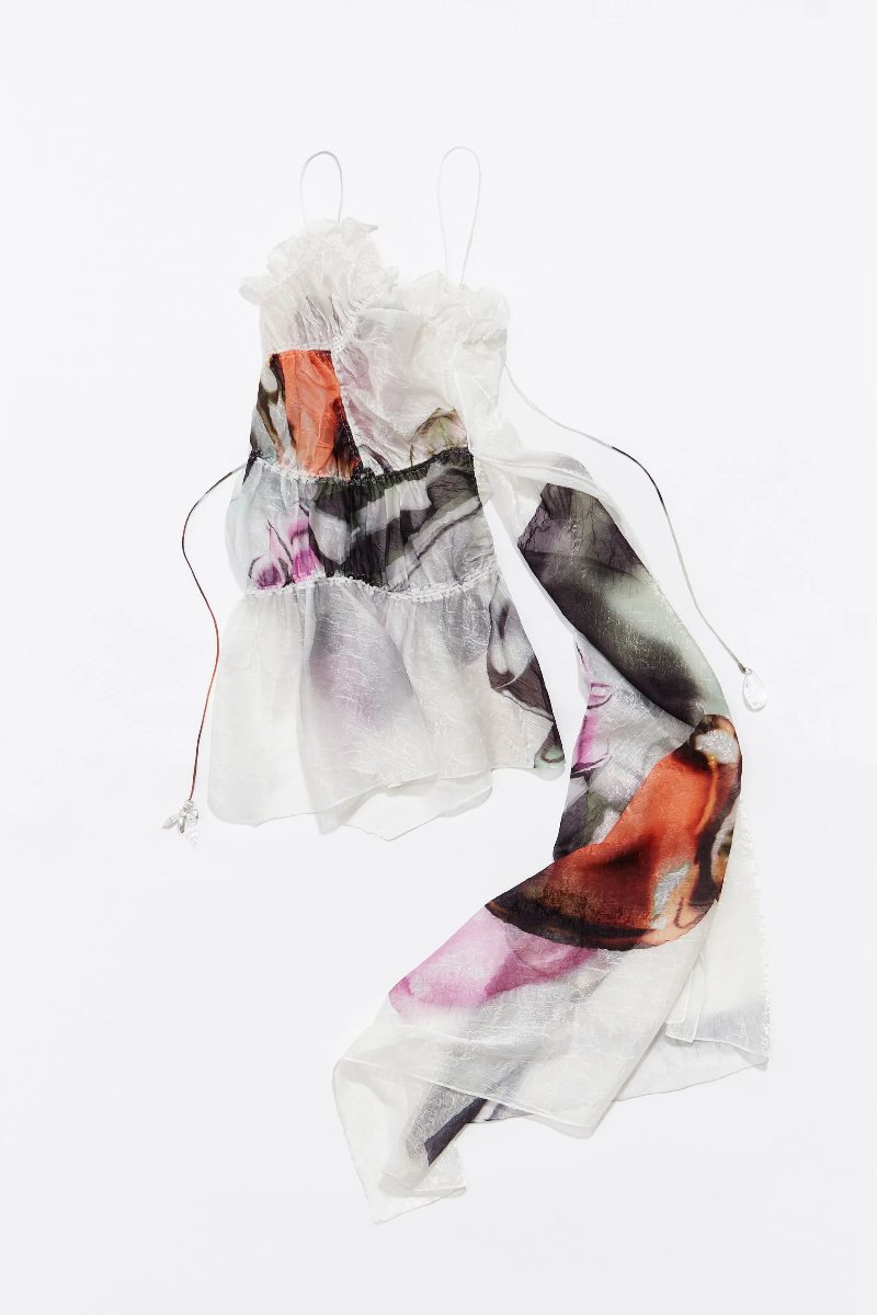 Empezamos con la prenda estrella de la colección. Es este vestido fruncido con tejido print inspirado en el mundo de fantasía. Nos encanta por el corte recto, los tirantes finos y por supuesto, el maxi pañuelo en el lateral. El vestido es muy fácil de combinar y de llevar. Puedes optar por utilizarlo como look de sábado noche, o si quieres jugar con las tendencias, añade un pantalón. ¿Qué te parece?