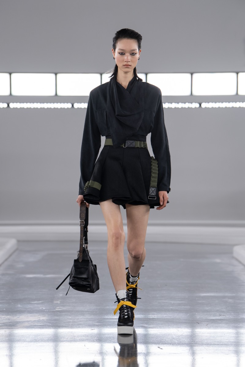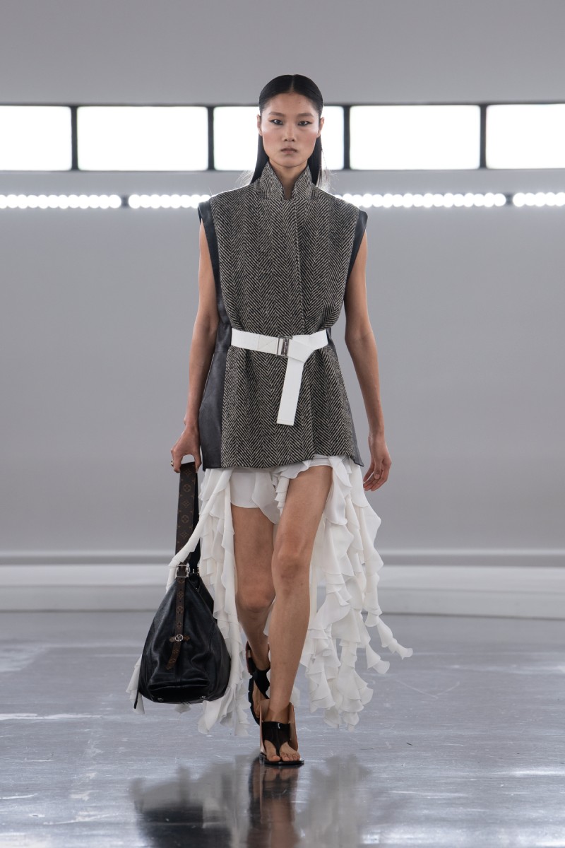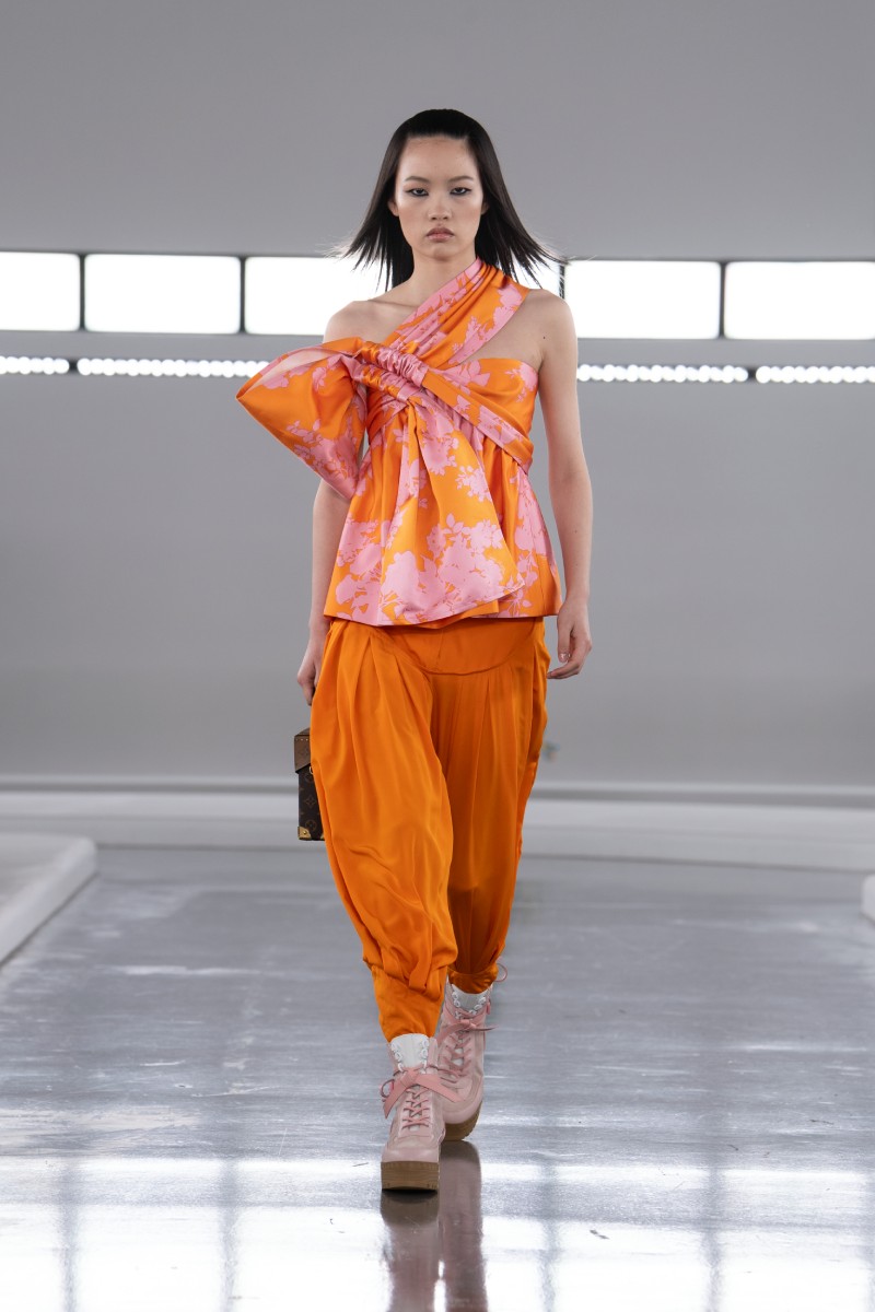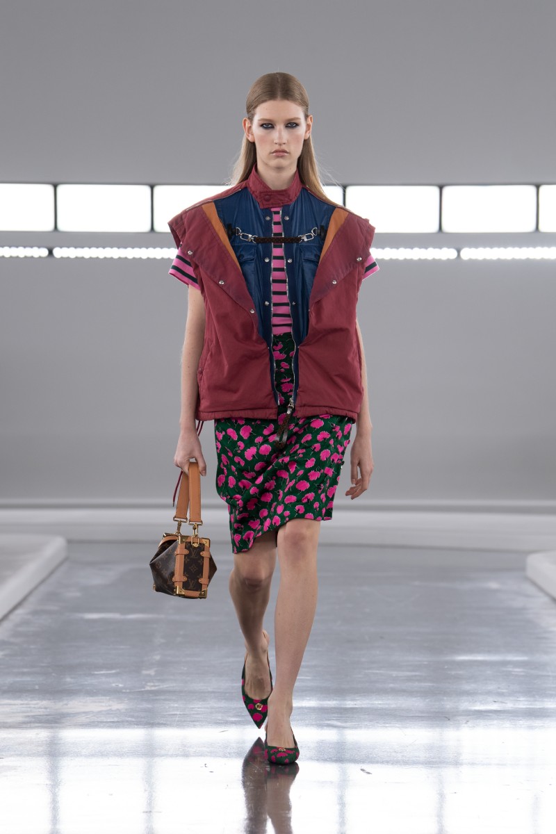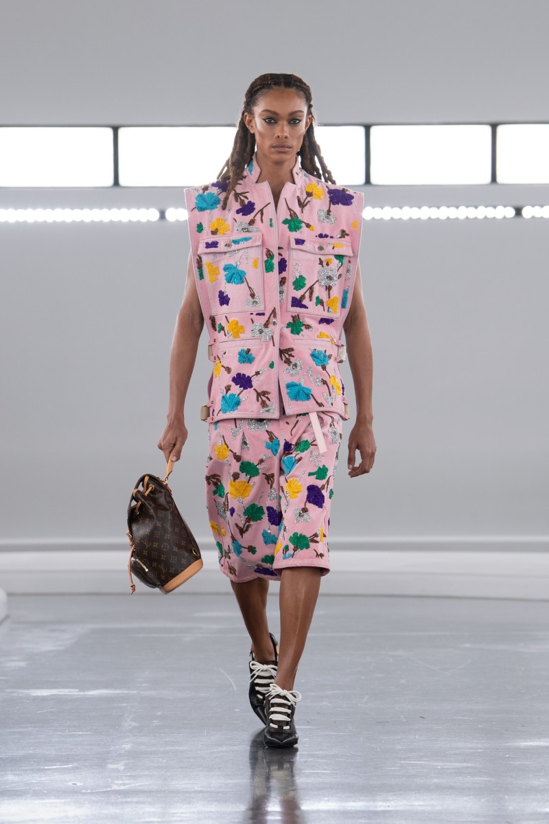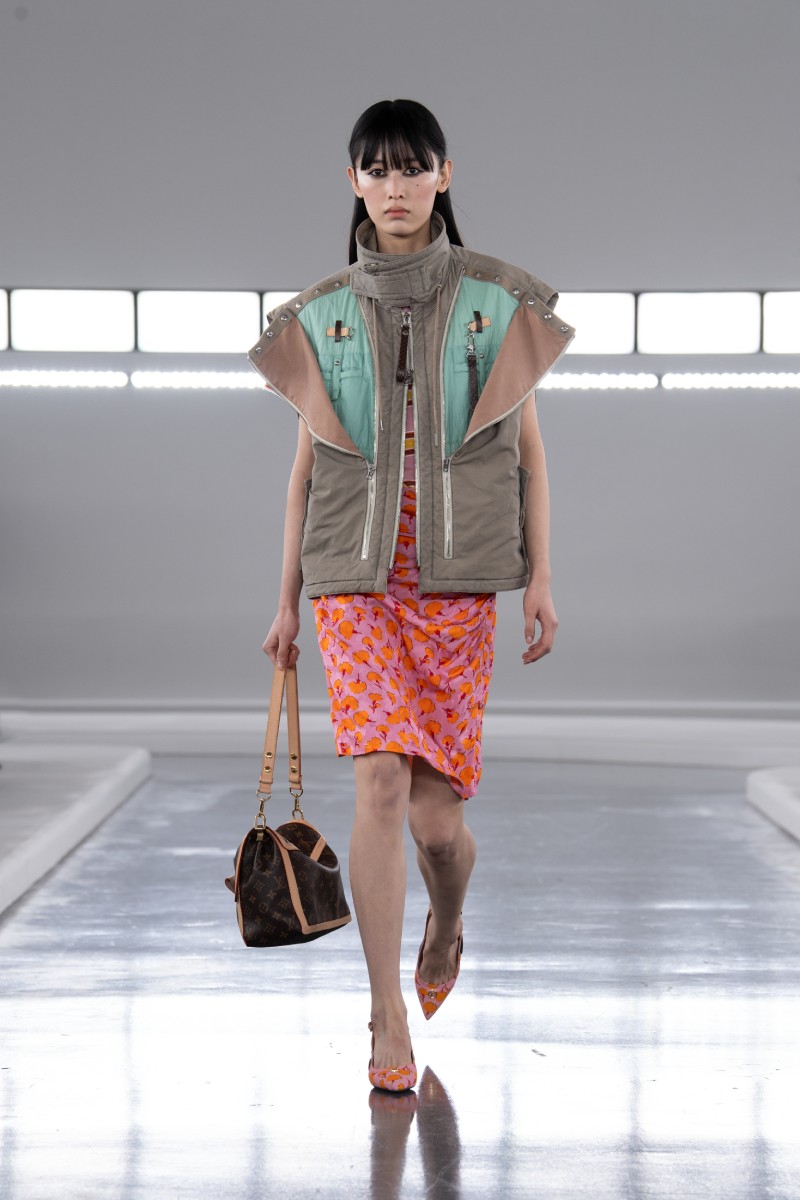 Otro de los puntos fuertes del lenguaje Ghesquière vuelve como protagonista de Louis Vuitton Prefall 2024. La mezcla de chic con utilitarismo se materializa en chalecos multibolsillos con siluetas de vanguardia. Seguidamente, prendas de mangas abullonadas y cinturas ultra ceñidas constituyen sus looks más comedidos. Eso, claro, hasta que llegamos a la parte floral con sus estampados a todo color y cortes asimétricos y escotados. Las faldas de frunces y su característica sastrería deconstruida también se hacen sentir dentro de la colección. Y todo esto nos lleva sus looks de noche: vestidos con bajos abullonados en forma de globo con lazos en el pecho. Un abrigo con apliques metálicos también emula esta silueta.
