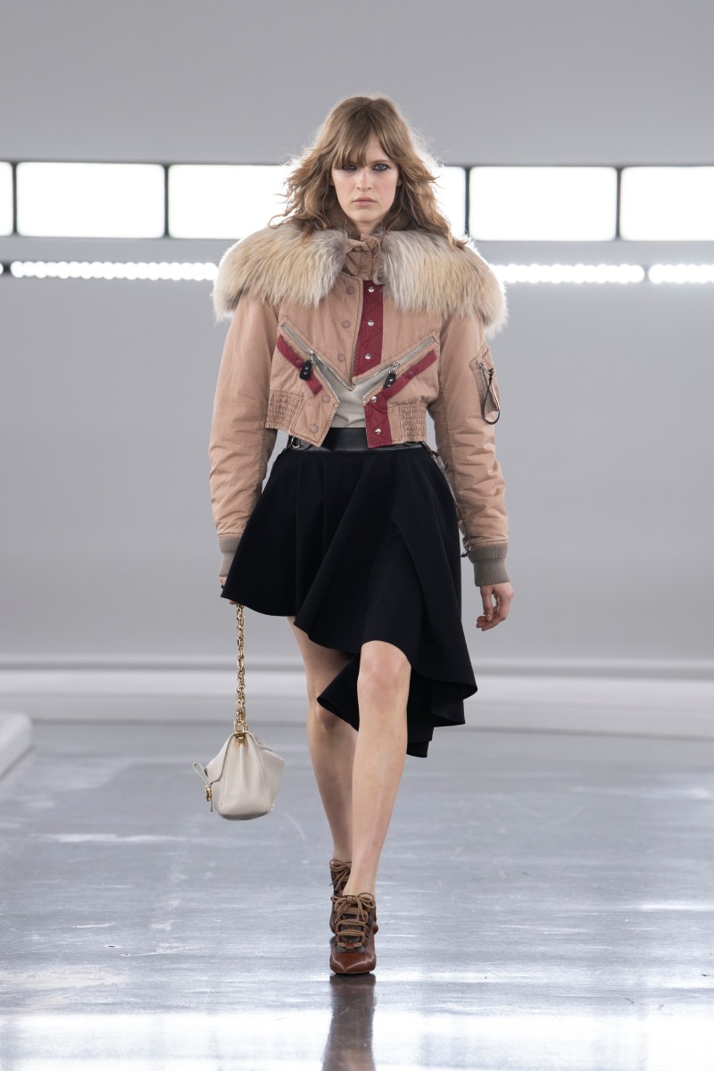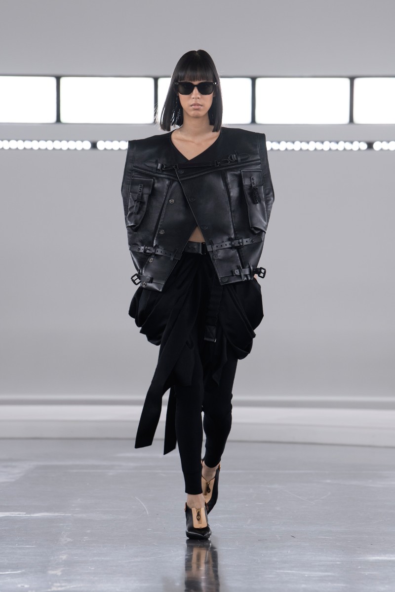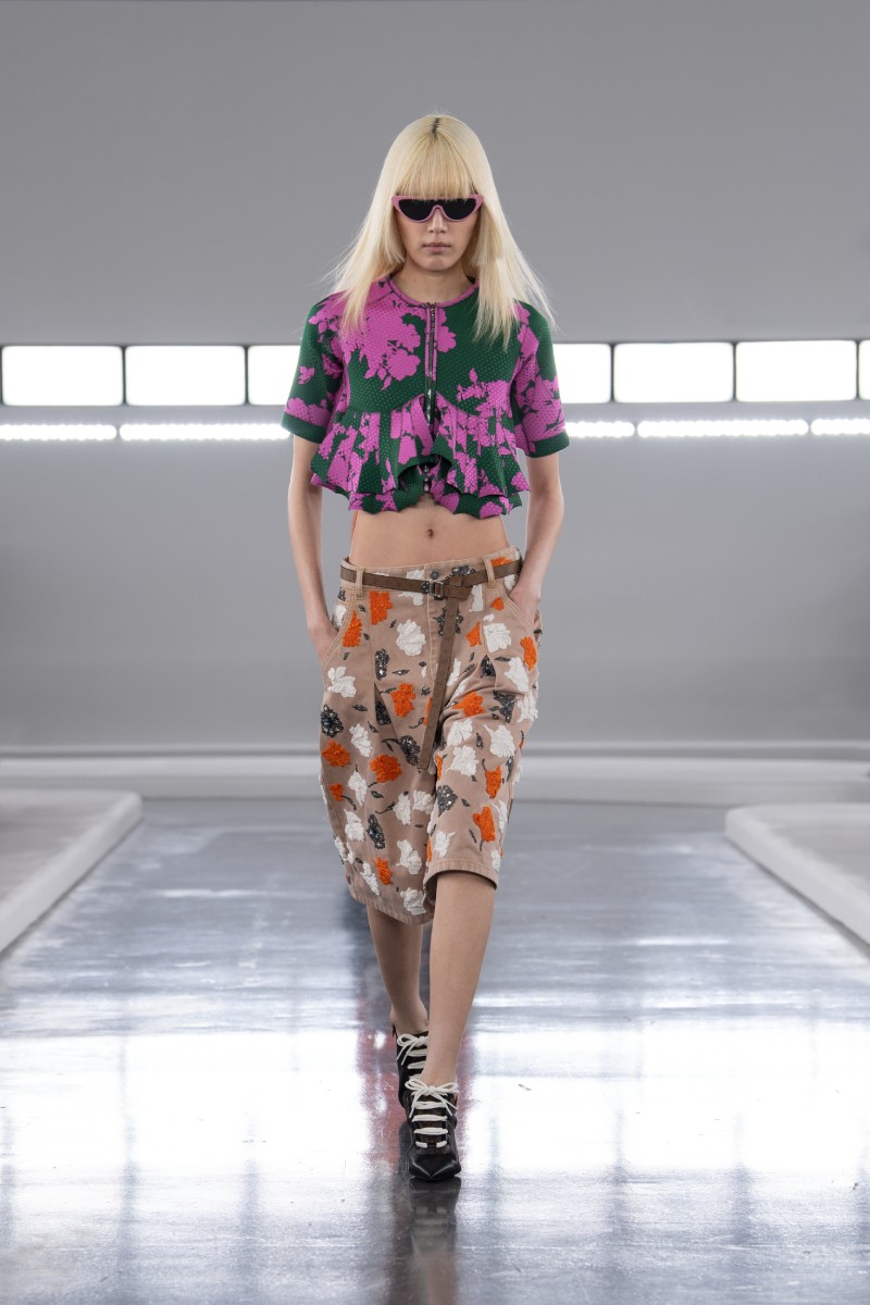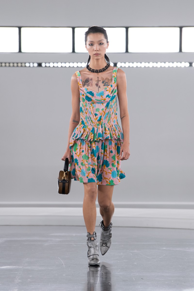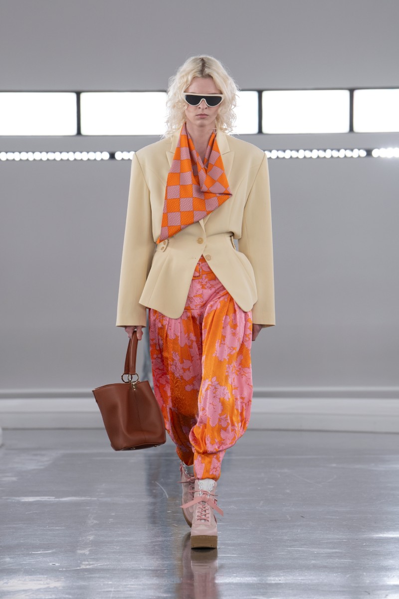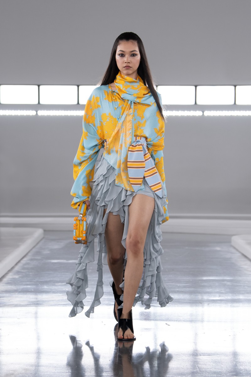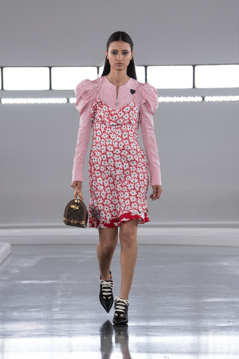 Otro de los puntos fuertes del lenguaje Ghesquière vuelve como protagonista de Louis Vuitton Prefall 2024. La mezcla de chic con utilitarismo se materializa en chalecos multibolsillos con siluetas de vanguardia. Seguidamente, prendas de mangas abullonadas y cinturas ultra ceñidas constituyen sus looks más comedidos. Eso, claro, hasta que llegamos a la parte floral con sus estampados a todo color y cortes asimétricos y escotados. Las faldas de frunces y su característica sastrería deconstruida también se hacen sentir dentro de la colección. Y todo esto nos lleva sus looks de noche: vestidos con bajos abullonados en forma de globo con lazos en el pecho. Un abrigo con apliques metálicos también emula esta silueta.