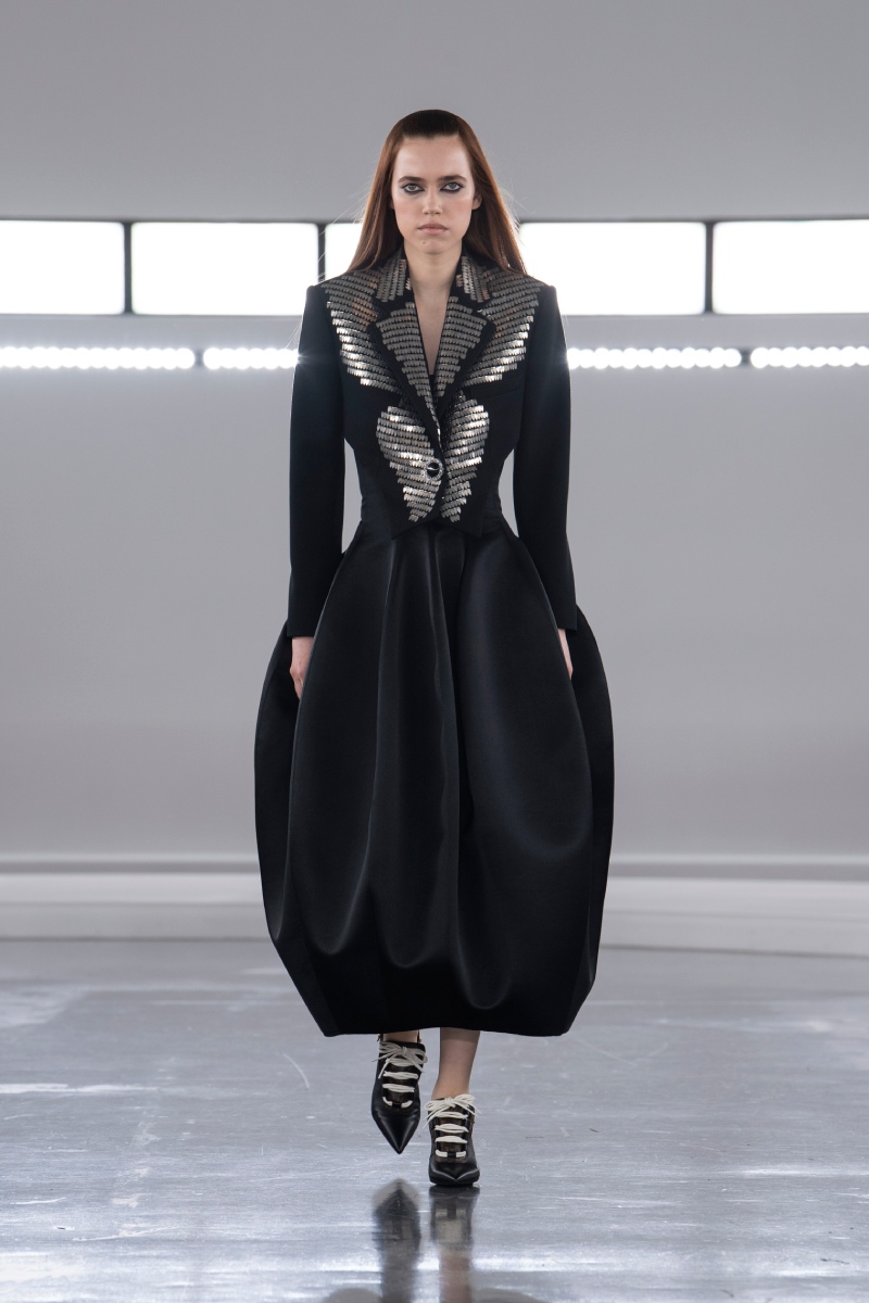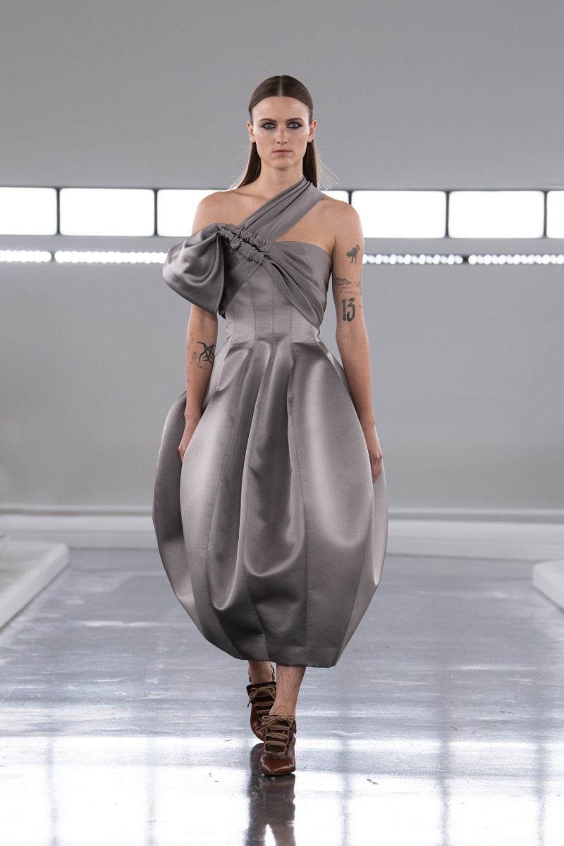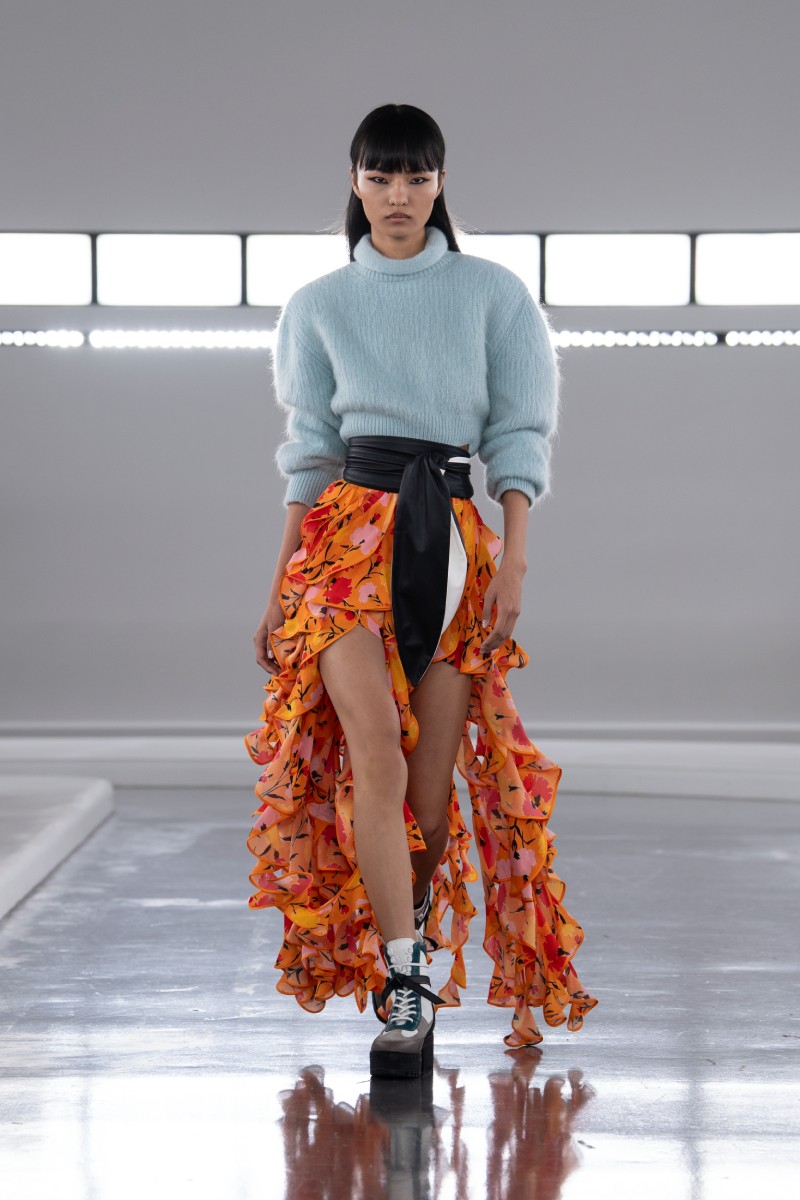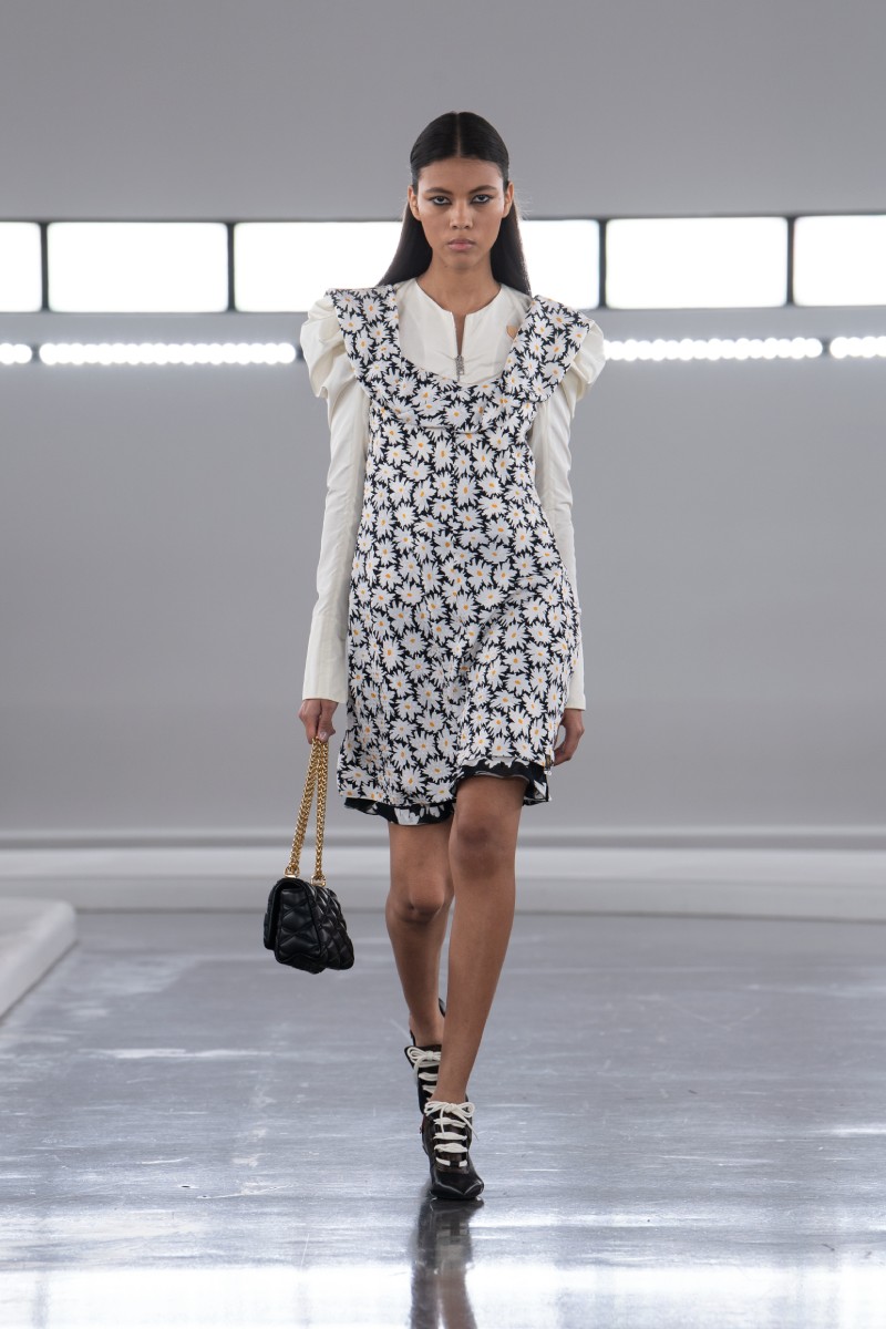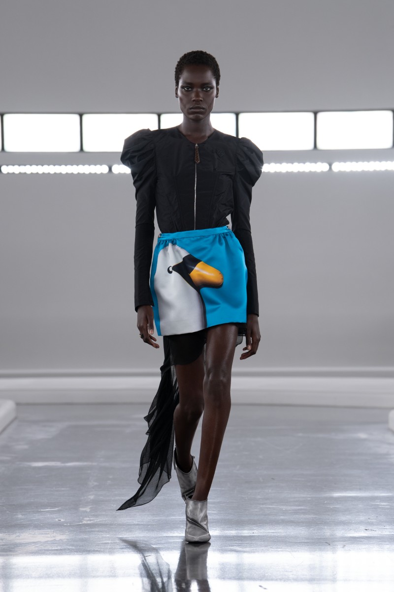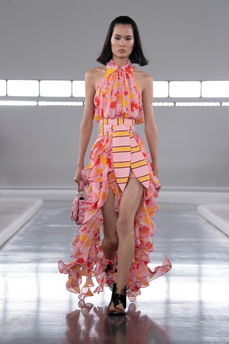 Otro de los puntos fuertes del lenguaje Ghesquière vuelve como protagonista de Louis Vuitton Prefall 2024. La mezcla de chic con utilitarismo se materializa en chalecos multibolsillos con siluetas de vanguardia. Seguidamente, prendas de mangas abullonadas y cinturas ultra ceñidas constituyen sus looks más comedidos. Eso, claro, hasta que llegamos a la parte floral con sus estampados a todo color y cortes asimétricos y escotados. Las faldas de frunces y su característica sastrería deconstruida también se hacen sentir dentro de la colección. Y todo esto nos lleva sus looks de noche: vestidos con bajos abullonados en forma de globo con lazos en el pecho. Un abrigo con apliques metálicos también emula esta silueta.