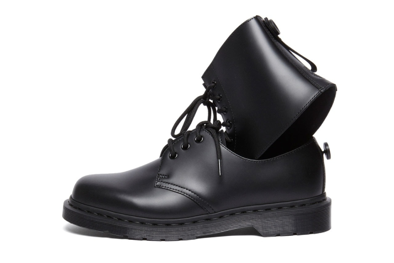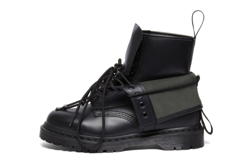 Siguiendo su lenguaje de distorsión de siluetas, Pratt reimagina la bota 1460 de toda la vida con una versión que apuesta por la superposición y la repetición de elementos a lo largo de todo el cuerpo. Los paneles del cuello y lateral se han introducido dobles, dejando el exterior sin coser y sin amarrar para que cuelgue. Los cordones siguen la misma receta, con un doble juego que se asegura con un tab justo en la puntera.