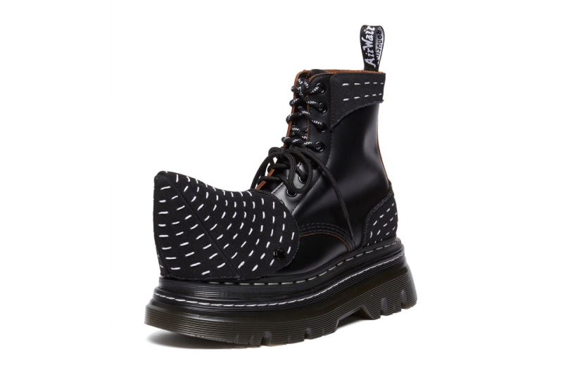 La segunda ganadora del concurso de Dr. Martens X Central Saint Martins apuesta por recodificar la silueta clásica de la bota. Ahora, Pulici añade volúmenes mucho más dramáticos al cuerpo con apliques en denim negro decorados con costuras sashiko. En la puntera, se añade un cuerno que acentúa el volumen escultórico de la 1460, mientras que en el cuello las cosas se mantienen mucho más minimalistas. La superposición sigue en el lower con una suela track de tacos con mediasuela doble.