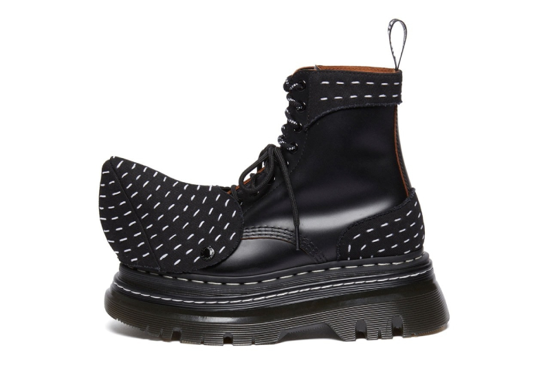 Cheng es una diseñadora enfocada en el womenswear con complejos patrones de corte y construcciones a capas. Su versión de las 1460 reimagina la silueta con una superposición de capas de tul negro sobre un cuerpo de piel clásica. Estos apliques envuelven el talón y lateral de la bota al asegurarse por medio de los cordones y ojales. Y hablando de cordones, Yanya Cheng reimaginó el clásico patrón de cordones de las botas con un sistema con el que se envuelve el talón de la bota con un cordón por cada par de ojales y todo se une con un gran lazo en el empeine.