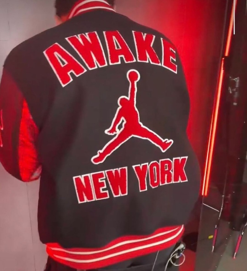 Junto con las AirShip, la colabo de Air Jordan X Awake NY también podría encabezar una cápsula de ropa. En el directo de SNKRS, vimos al brand director de la firma neoyorquina con una chaqueta de estilo varsity bastante especial que podría coronar la selección de prendas. Siguiendo la mítica combinación de colores Bred la chaqueta presenta detalles de branding conjunto, paneles de piel de serpiente (a juego con las AirShip) y bordados referentes con la historia de ambas marcas.