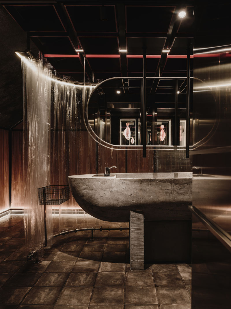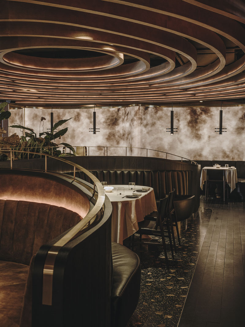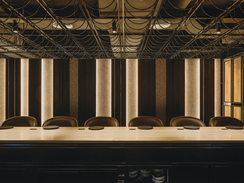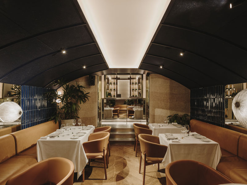 Leña es un restaurante en el que puedes volver muchas veces y vivir una experiencia diferente en cada momento. De algún modo lo que buscábamos era potenciar el momento, creando un recuerdo que te invita a volver”, puntualizan desde Astet. En su diseño han trabajado con materiales muy diversos, pero, sobre todo, con dos que están totalmente vinculados a la esencia del concepto del proyecto: la piedra y la madera. Estos dos elementos principales han sido utilizados de diferentes modos para generar contrastes y también para crear distintas escenografías. También han trabajado con otros componentes como el latón, el micro cemento, los estucos, la piel, la madera quemada (con la técnica japonesa Yakisugi), con tejidos como el terciopelo y con vidrios diseñados por ellos mismos. El mobiliario utilizado proviene de marcas como Porro, Fredericia, Gommaire, Stellarworks o Menu, aunque ellos también han diseñado algunas sillas y luminarias.