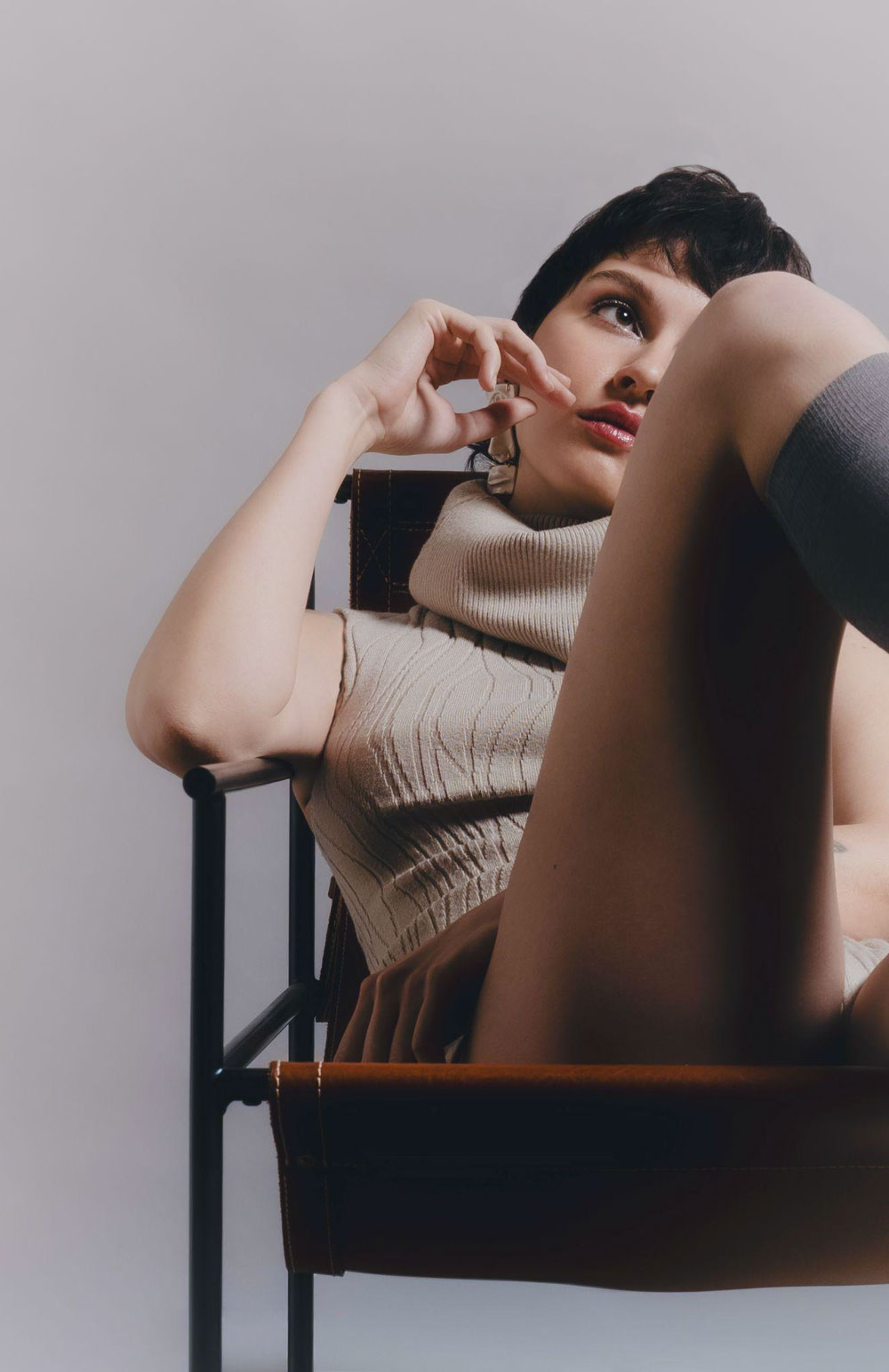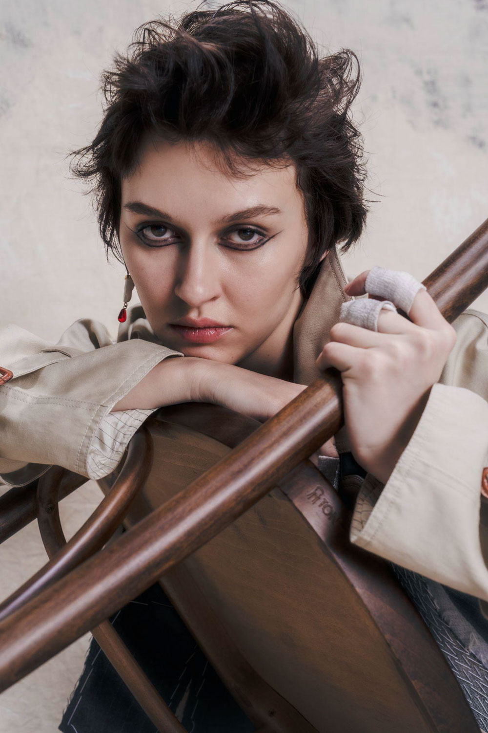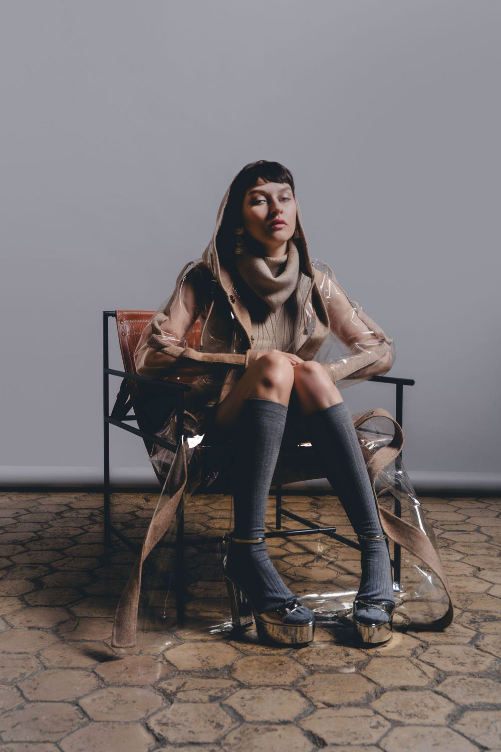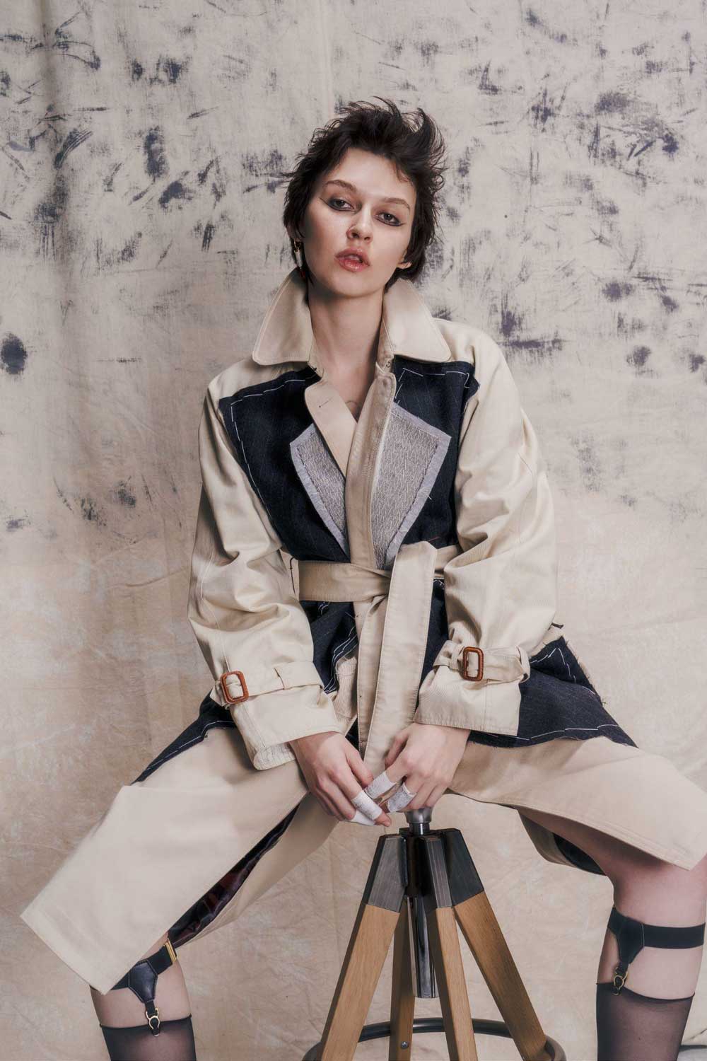 Existencialismo feminista y moda: Trench y Shorts PAOLO LEDUC (@paololeduc), Calcetines y Liguero MAISON CLOSE (@maison_close), Zapatos OTRURA (@casaotrura) y Pendiente ANDRÉS GALLARDO (@andresgallardofficial), Silla CUBIÑÁ en CUBIÑÁ (@cubinya_barcelona)