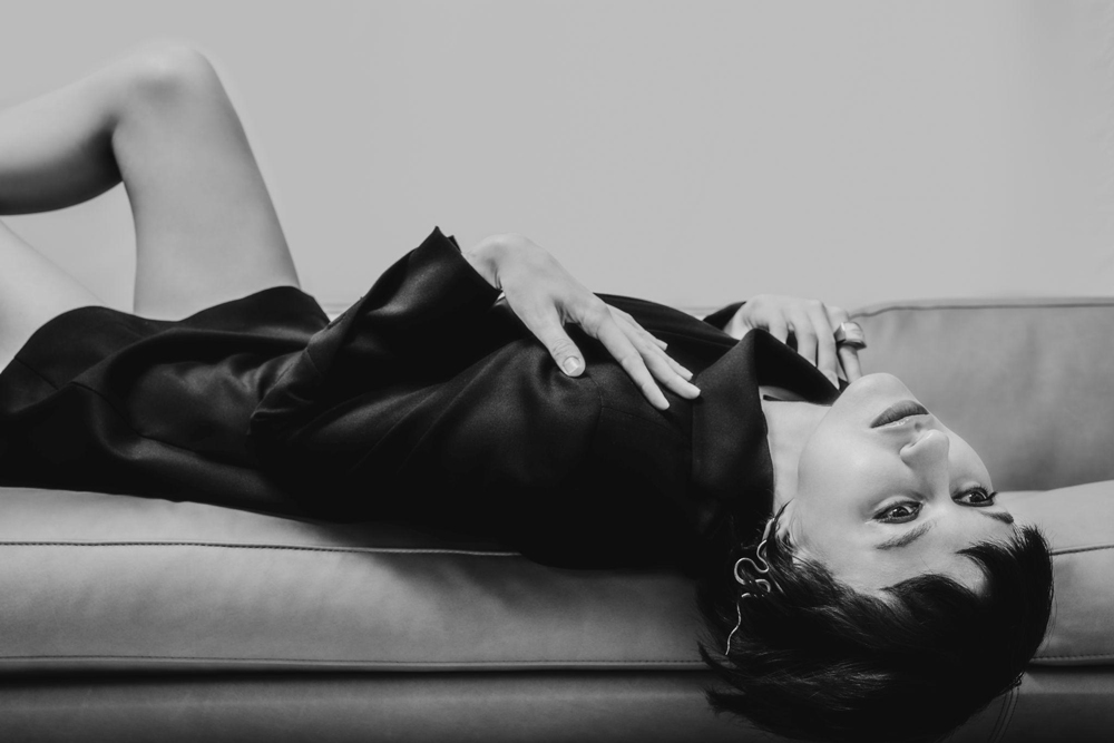 Vestido ADOLFO DOMÍNGUEZ (@adolfodominguezofficial), Anillo y Pendientes ANDRÉS GALLARDO (@andresgallardofficial), Sofá INLAND de ANDERSSEN & VOLL para &TRADITION (@andtradition) en CUBIÑÁ (@cubinya_barcelona)