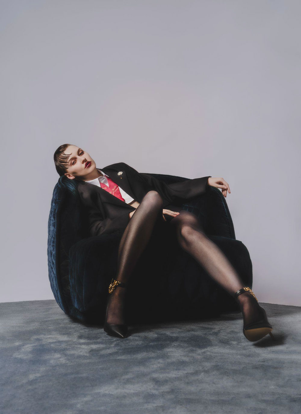 Mujeres intelectuales de moda: Chaqueta ADOLFO DOMÍNGUEZ (@adolfodominguezofficial), Pañuelo GUCCI (@gucci), Medias MAISON CLOSE (@maison_close), Braguita DOLCE & GABBANA (@dolcegabbana), Zapatos MICHAEL KORS, (@michaelkors) y Alfiler ANDRÉS GALLARDO (@andresgallardofficial), Butaca REDONDO de PATRICIA URQUIOLA para MOROSO (@morosofficial) en CUBIÑÁ (@cubinya_barcelona)