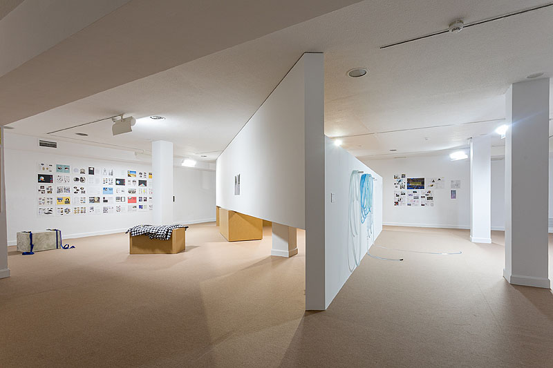 Un paisaje que lejos de guiar, acompaña y arropa las visiones y las resonancias de lo exhibido, como describe la propia comisaria, “como un corte en el espacio y en el tiempo, blando, algo así como un corte hecho en el agua con un cuchillo”, un manto azul sobre el que quedan suspendidos los muros y lo que pende de ellos; un busto y un pellejo, dentro de una pecera donde pantanos de tristeza temática, terminan por engullir las paredes tersas de la sala.