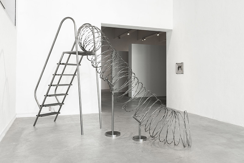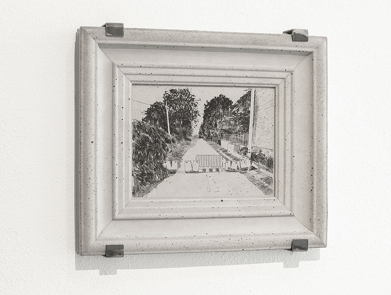 La exposición se completa con otras obras de Adrián Castañeda que reflexionan críticamente sobre la gestión europea de los flujos migratorios, como Bienvenidos (2021): un tobogán con una malla de cableado militar que pone de manifiesto la hostilidad que caracteriza a los centros de acogida de menores en la entrada de España. O la serie Sin título, de 2024, formada por cuatro piezas que transfieren, a través del calco, la imagen de fotografías extraídas de Google Street View de distintos espacios de reclusión, sobre marcos de cemento.