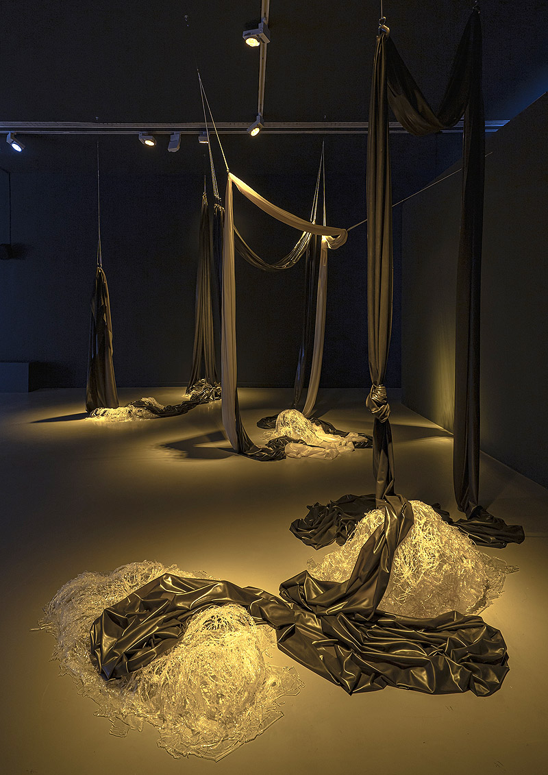 “Dialogues” ,de Salem Amar, consiste en una videoinstalación que surge de un archivo y consta de seis entrevistas psiquiátricas. A fin de seleccionar y recontextualizar sus estructuras lingüísticas, transcribiéndolas y recopilando los fragmentos de estos discursos para crear una obra con un tono conexionado. En este entrelazamiento, se encuentran momentos de belleza inesperada, algunos de índole gramatical, otros estructurales, así como melodías rítmicas que emergen de la repetición. Por último, “Succulentbonds”, de Weixin Quek Chong, plantea temáticas como la sujeción, el estiramiento, la restricción y la torsión. Estas son contrastadas con la caída, la relajación y la fluidez mediante pieles colgantes de látex que forman un camino de gestos fluidos y se acumulan en cuerpos de resina transparente. En el interior de este bosque, o guarida fetichista, el olor característico de este material, orgánico y brillante, se complementa con un sutil acompañamiento sonoro.