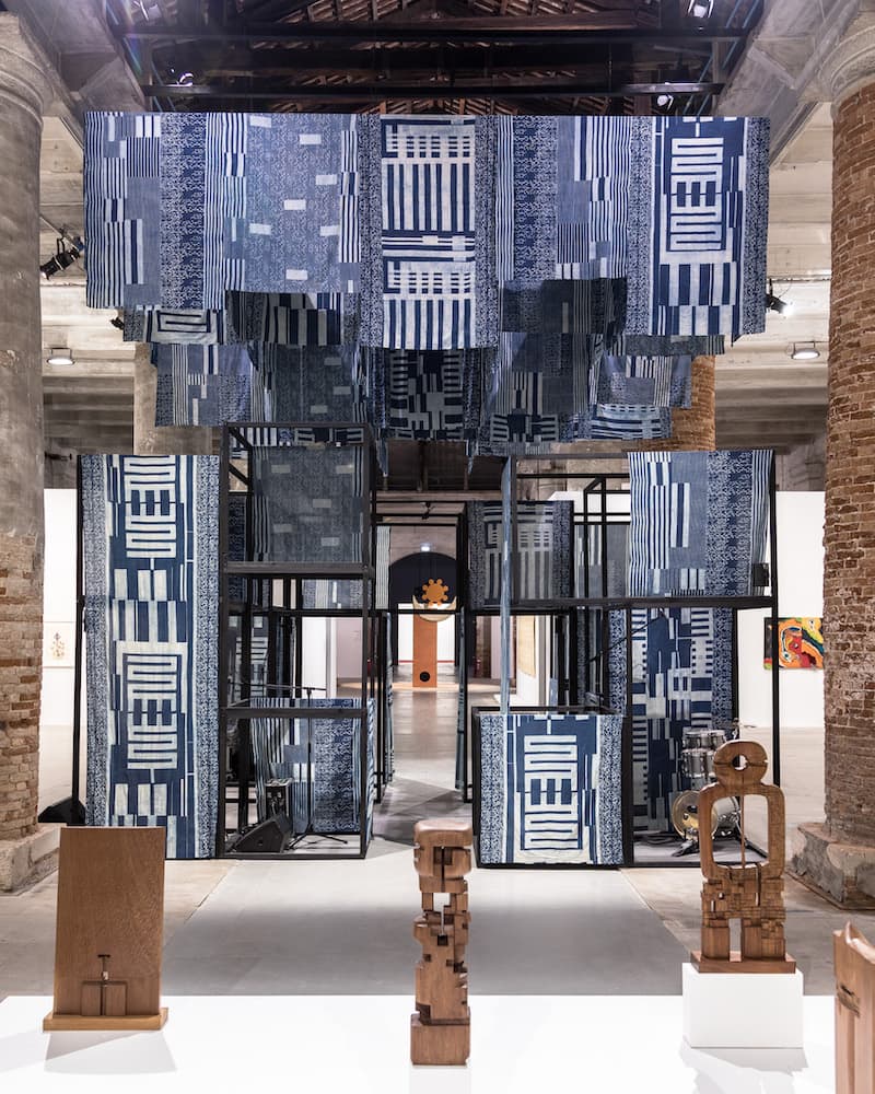 Un astronauta con casco de tamaño natural de Yinka Shonibare (artista nigeriano también presente en el pabellón de Nigeria) se detiene a la entrada del Arsenale. Vestido con un traje espacial de tejido holandés estampado en cera lleva una malla llena de maletas. Es un forastero en tierra extraña que camina hacia una sombra rayada que se proyecta a través de la enorme celosía de la obra ganadora de las Matahoo.