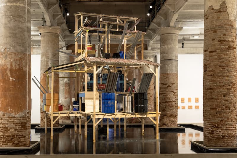 Por su parte “Aguacero” es una instalación site specific de Daniel Otero Torres. Realizada con materiales locales reciclados e inspirada en la arquitectura vernácula de zancos de la comunidad embera de Colombia. La estructura destaca la lucha de comunidades marginadas por acceder a agua potable, relacionándola con problemas globales de privatización y financiación de la naturaleza.